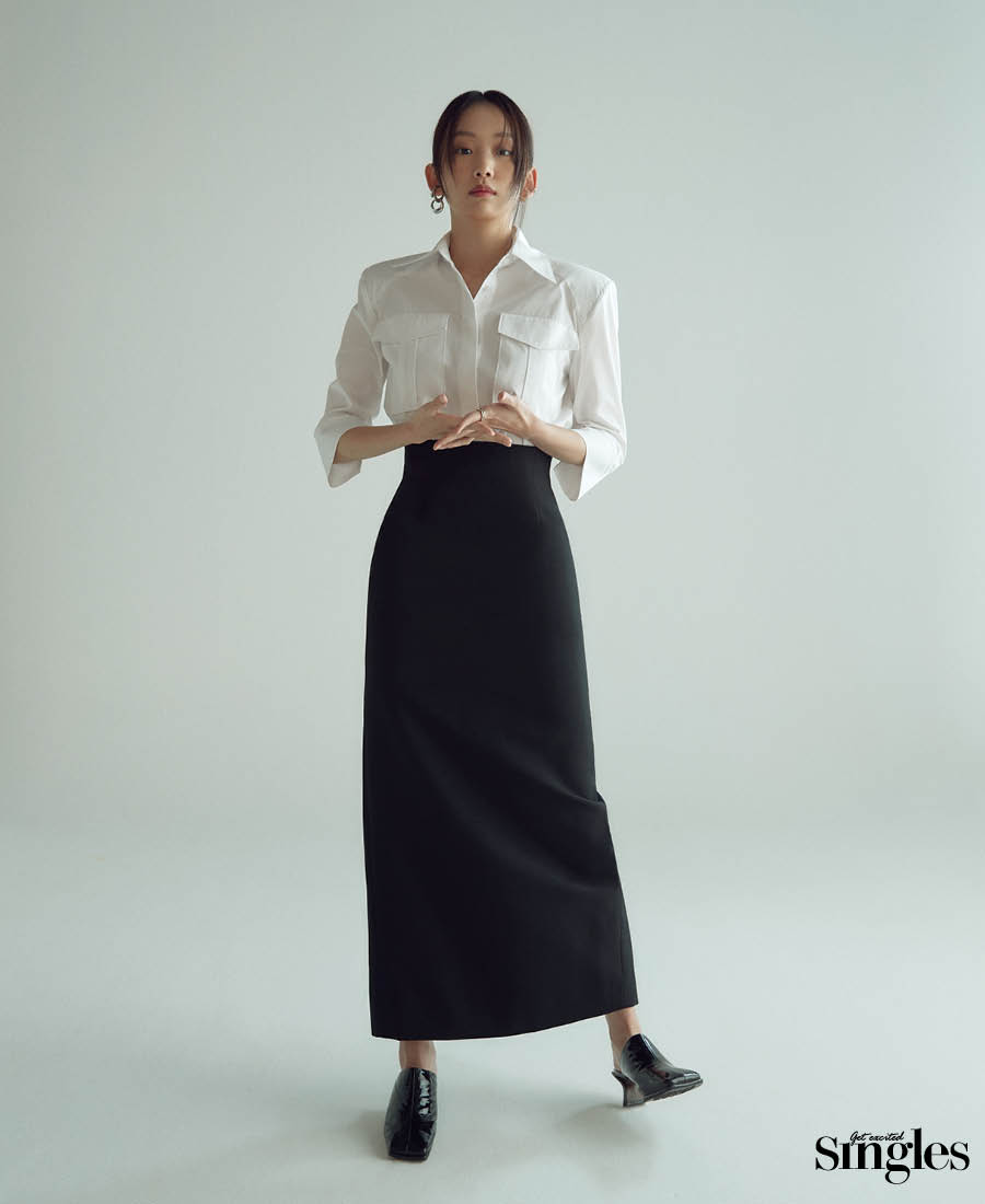 셔츠와 스커트 모두 핑크공, 오른쪽 귀에 착용한 이어 커프와 이어링, 왼쪽 귀 아래에 착용한 이어 커프 모두 넘버링, 왼쪽 귀 위에 착용한 이어 커프와 검지에 착용한 링 모두 아프로즈×아몬즈, 뮬 렉켄.