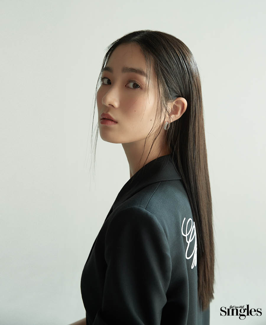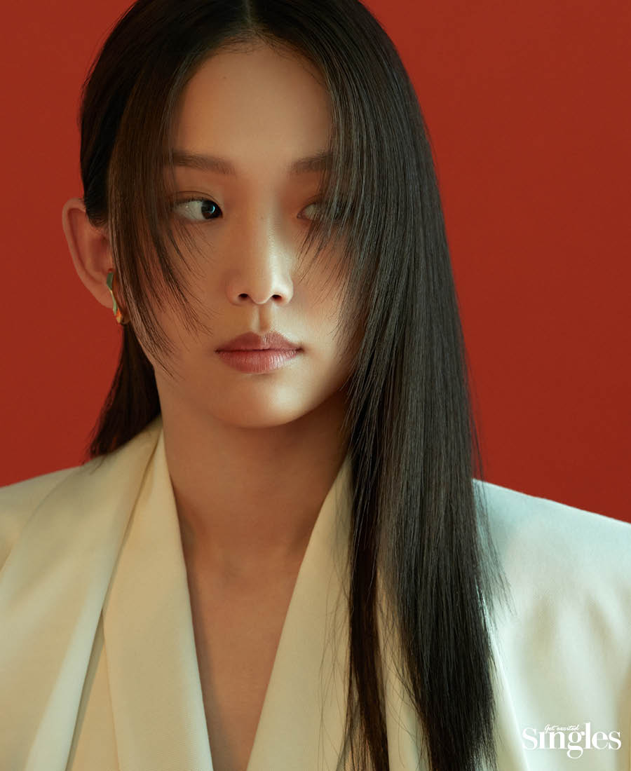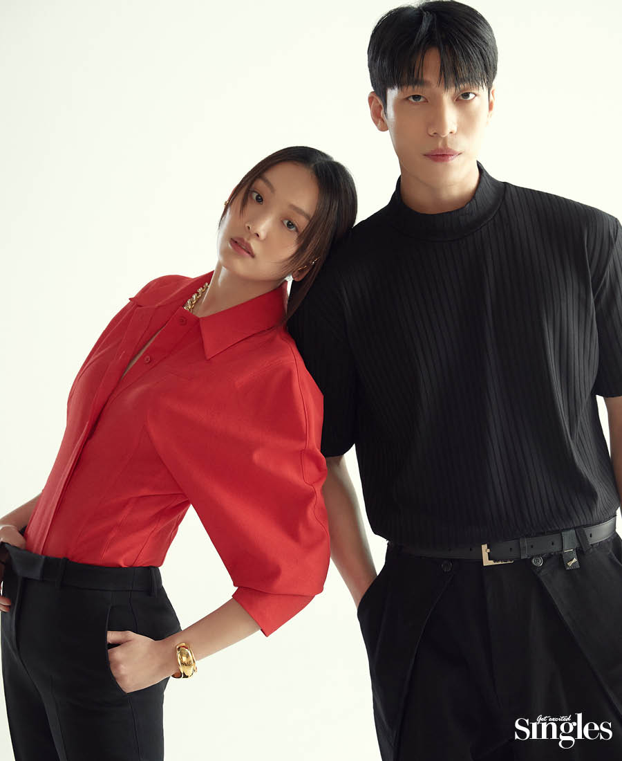 진기주 셔츠 분더캄머, 오른쪽 귀의 이어 커프 마마카사르, 왼쪽 귀의 이어 커프 허라디×아몬즈, 네크리스 타니 by 미네타니, 뱅글 쉐레. 위하준 톱 SSY, 팬츠 송지오, 벨트 아더에러.