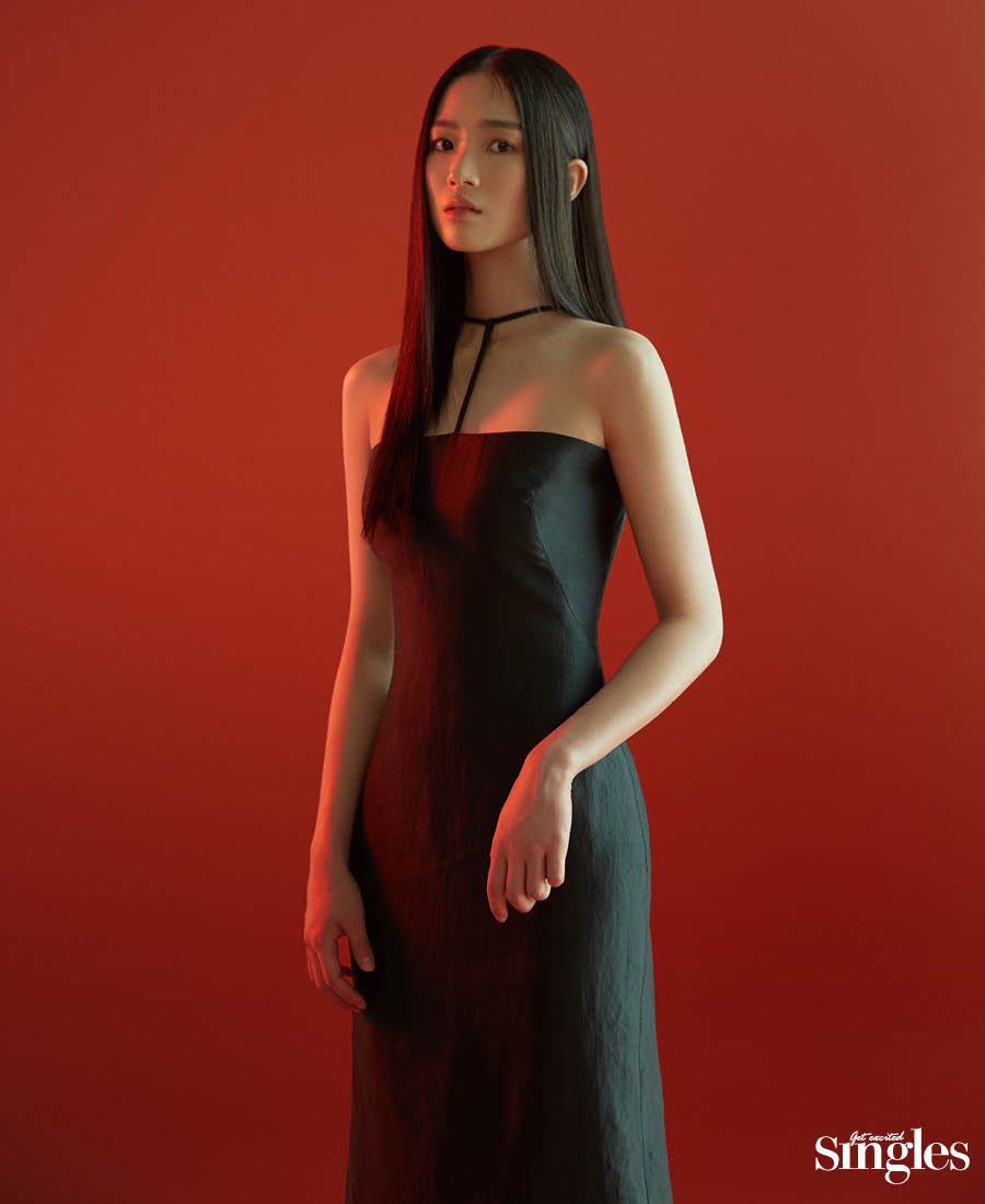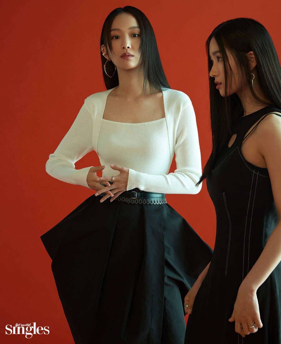 진기주 톱 해브레스 for 하고, 스커트 드미어, 위쪽 이어 커프와 링 아프로즈×아몬즈, 중간 이어 커프 마마카사르, 후프 이어링 허라디×아몬즈, 벨트 알라이아 by 10꼬르소꼬모. 김혜윤 드레스와 안에 입은 톱 모두 리유니, 이어링 타티아나, 오른손 검지에 착용한 링 구찌, 왼손 약지에 착용한 링 이든.