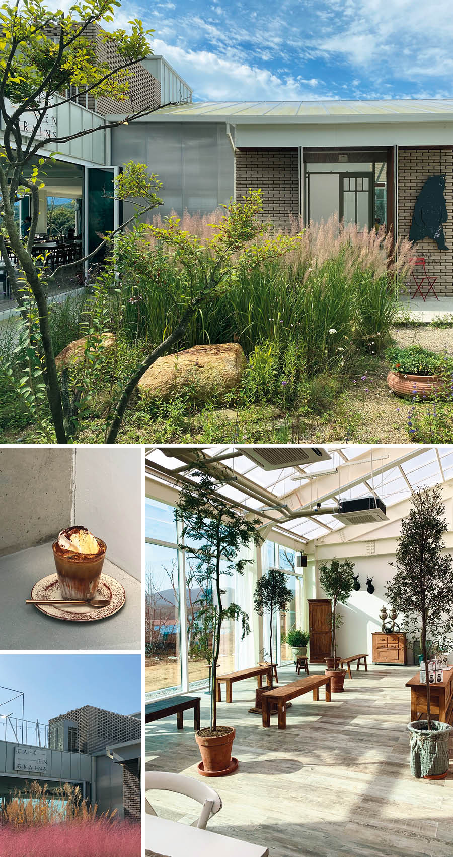 카페 앙 그랑은 용인의 용담 저수지 근처에 위치해 드라이브 명소로 사랑받는다. 별장처럼 지은 건물 안에 카페와 쇼룸이 같이 있다. 중정에는 계절별로 갈대와 핑크뮬리, 초록 잎사귀들이 자란다. 건물 처마 아래에 놓인 테이블에 가만히 앉아 있노라면 프랑스 남부 시골 지방의 한적한 저택으로 순간이동해 온 기분이다.