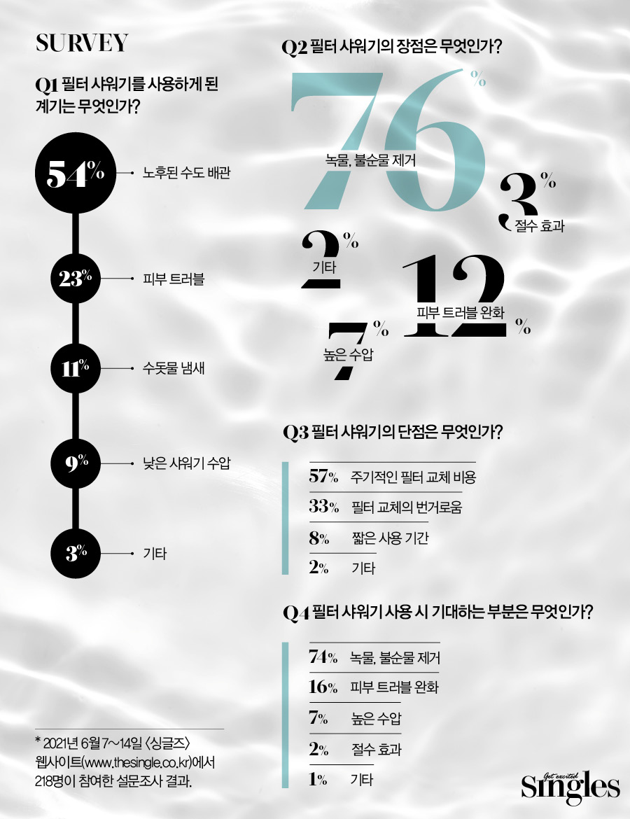그렇다면 우리가 필터 샤워기를 사용하는 진짜 이유는 무엇일까. <싱글즈> 설문조사에 참여한 필터 샤워기 사용자 중 54%는 노후된 수도 배관을 계기로 꼽았다. 필터 샤워기 전문 브랜드 루루벨의 MD 정연혁은 “요즘은 신축 건물이라 하더라도 노후된 수도관 시설 때문에 걱정이 많죠. 샤워를 하고 입안을 헹구기도 하는 물에 녹물이나 불순물이 담겨 있다면, 개운하려고 하는 샤워에서 되레 찝찝함을 느끼게 될 거예요. 매일의 시작과 마무리를 함께 하는 샤워를 더욱 깨끗하게 하고 싶은 건 누구나 같은 마음이니까요”라는 말로 인기 있는 이유를 뒷받침했다.