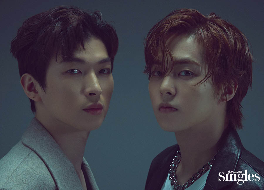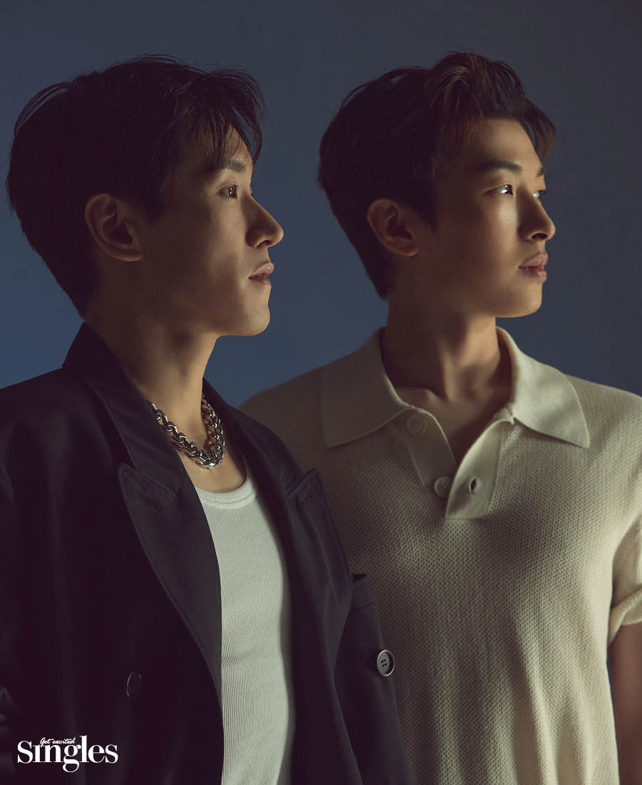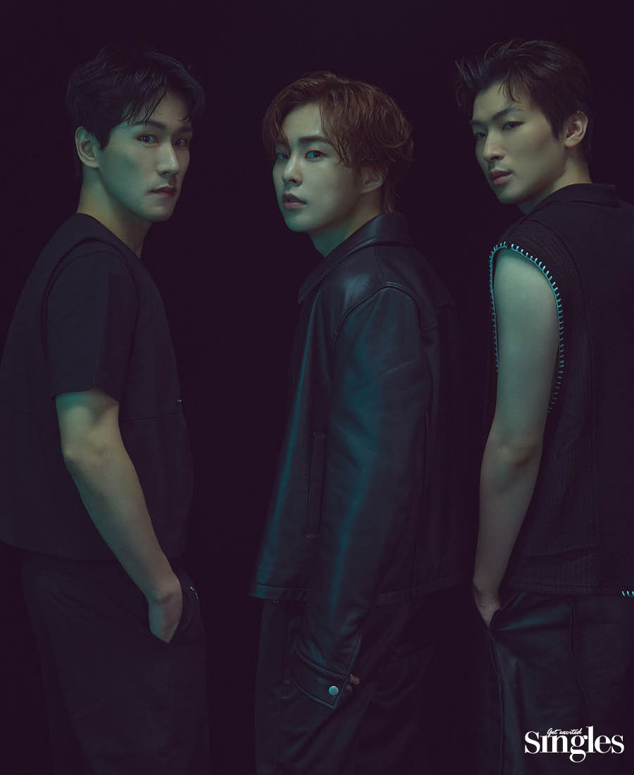 조형균 베스트와 팬츠 하우, 티셔츠 코스. 시우민 재킷과 팬츠 윈더, 네크리스 불레또, 슬리브리스 톱 스타일리스트 소장품. 박강현 니트 톱 레씨토, 레더 버뮤다 팬츠 막시제이.