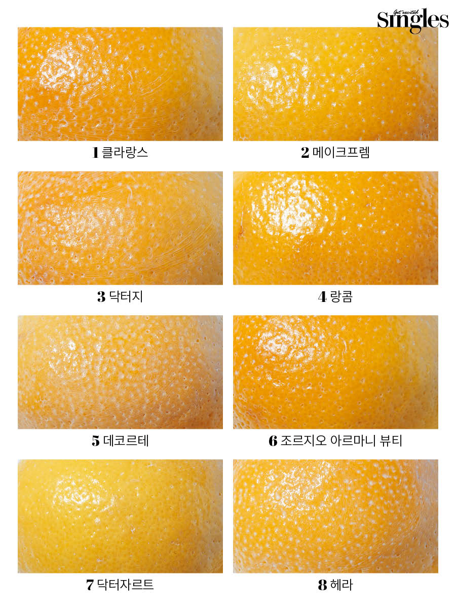 실험 방법 오렌지 껍질 위에 선크림을 직접 발랐을 때 크고 작은 굴곡을 얼마나 매끈하게 커버하는지 확인했다. 끼임이 적을수록 발림성이 부드러운 제품.