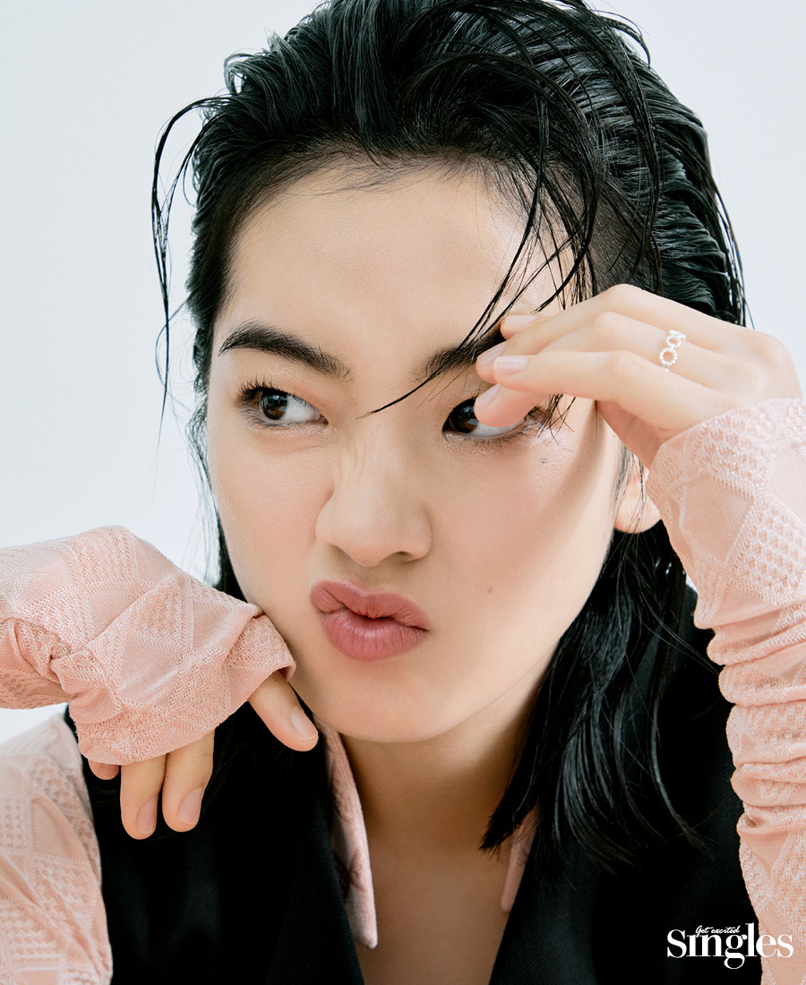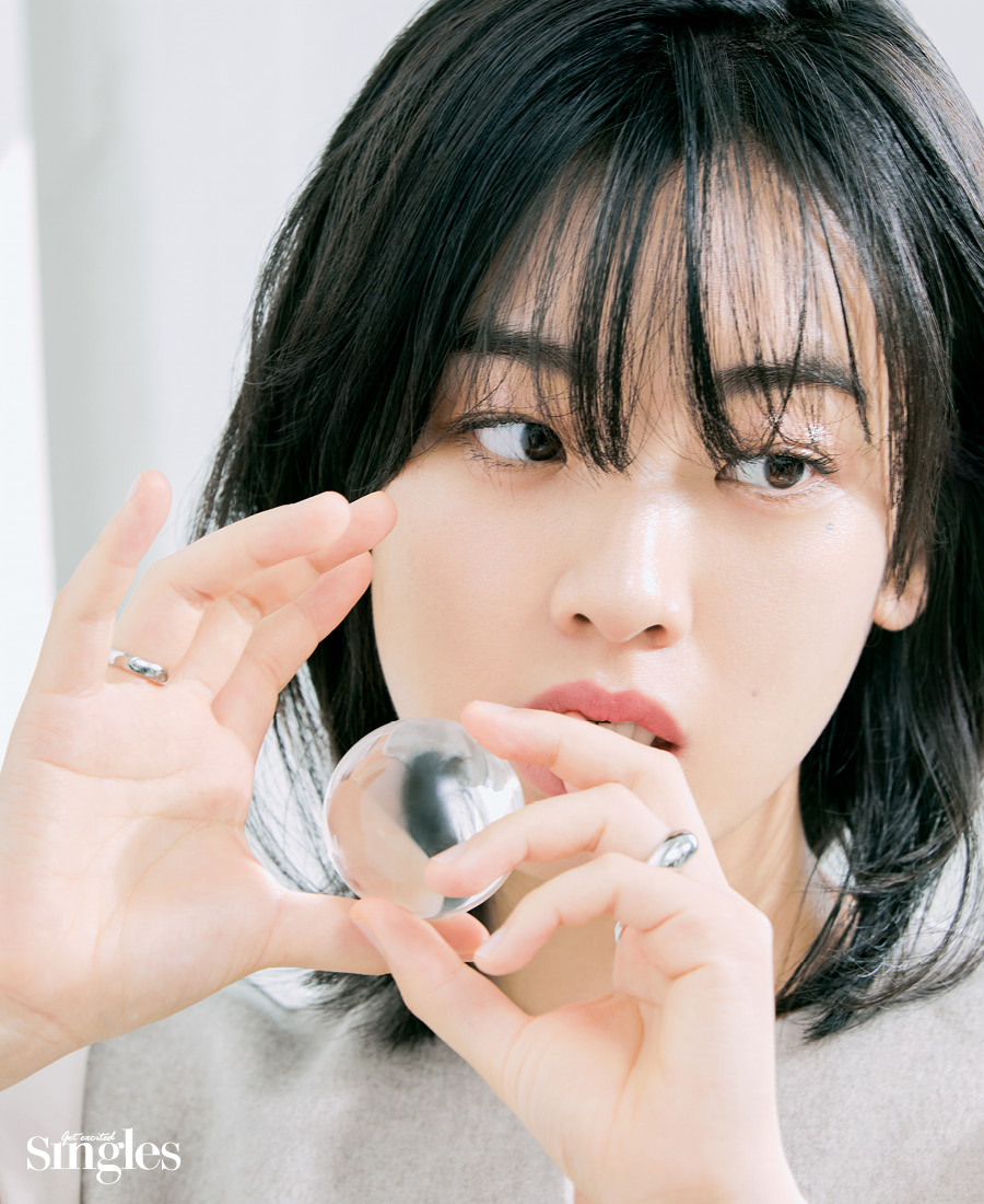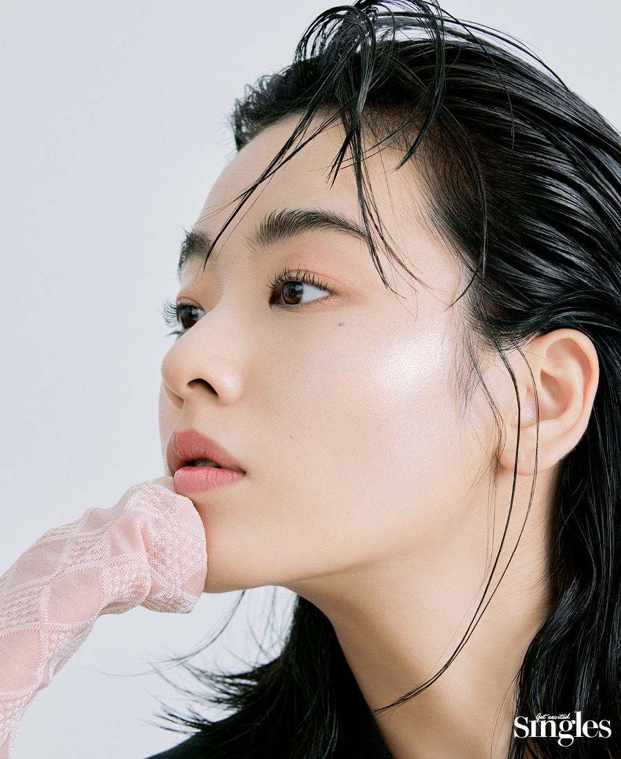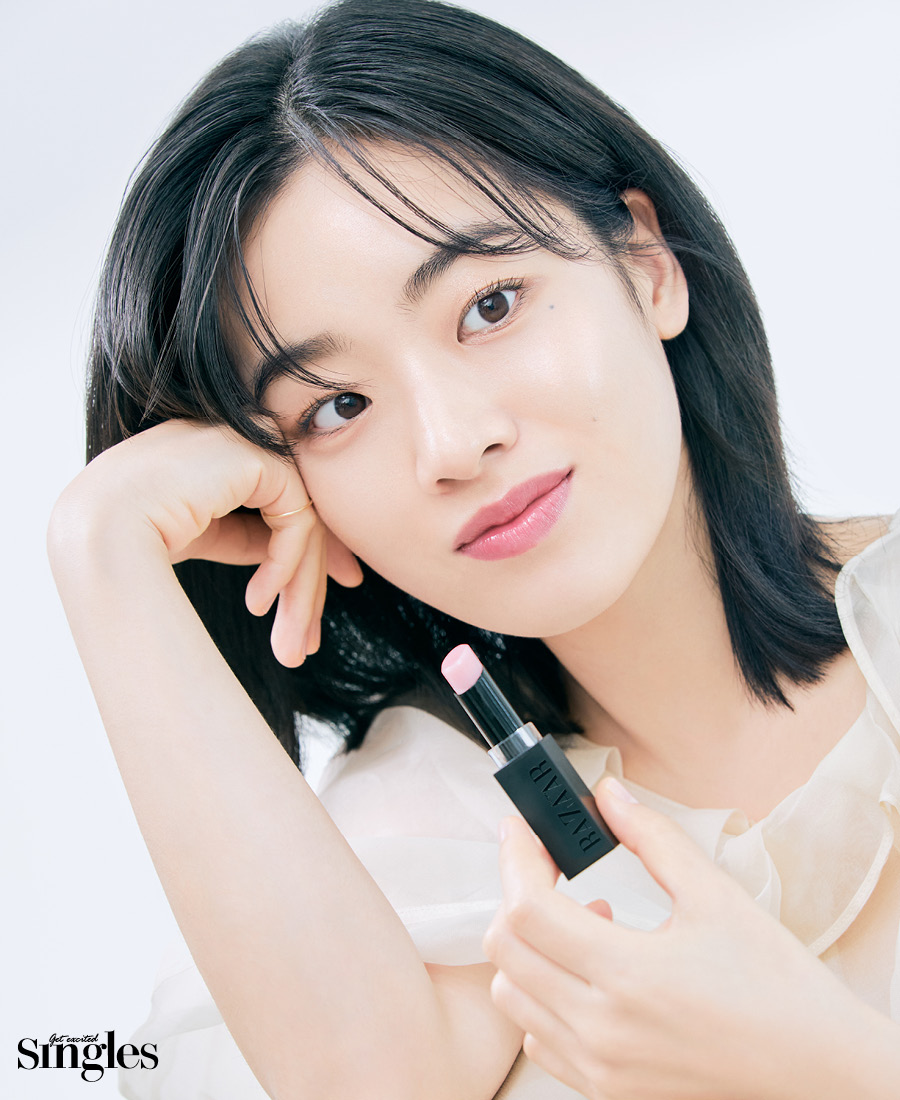 투명한 광택이 도는 이주영의 입술은 하퍼스 바자 코스메틱 멜팅 터치 립 밤을 바른 것. 탁월한 보습력의 피오니 꽃 추출물과 시어버터, 카카오씨버터 그리고 영양이 풍부한 식물성 오일 성분이 들어 있어 건조해서 갈라진 입술을 금세 매끈하게 만든다. 입술 온도에 맞춰 은은하게 발색되는 핑크 컬러가 건강한 생기까지 챙긴다. 예상치 못한 마스크 오프에도 당당할 수 있는 이유다.