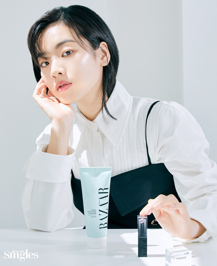 햇살 아래에서 더욱 존재감을 발하는 이주영의 빛나는 피부와 입술. 타고난 듯 맑은 피부는 촉촉한 수분 클렌징이 기본이다. 하퍼스 바자 코스메틱 아쿠아 페어 폼 클렌저는 세안 후에도 땅김 없는 보습력을 갖춰 피부가 편안하다. 물기를 머금은 핑크빛 입술은 하퍼스 바자 코스메틱 멜팅 터치 립 밤으로 표현한 것. 입술에 사르르 녹아 푸석한 각질을 잠재우고 쫀득한 탄력감까지 선사한다. 시간이 지나면 자연스럽게 컬러가 올라와 피부톤을 화사하게 밝힌다.