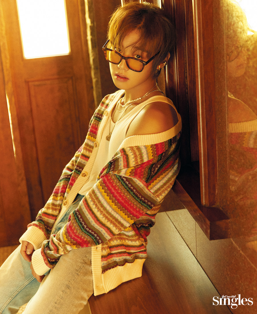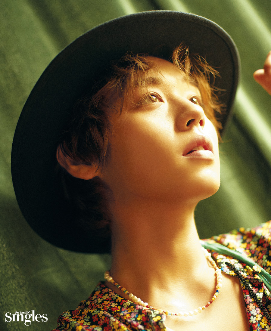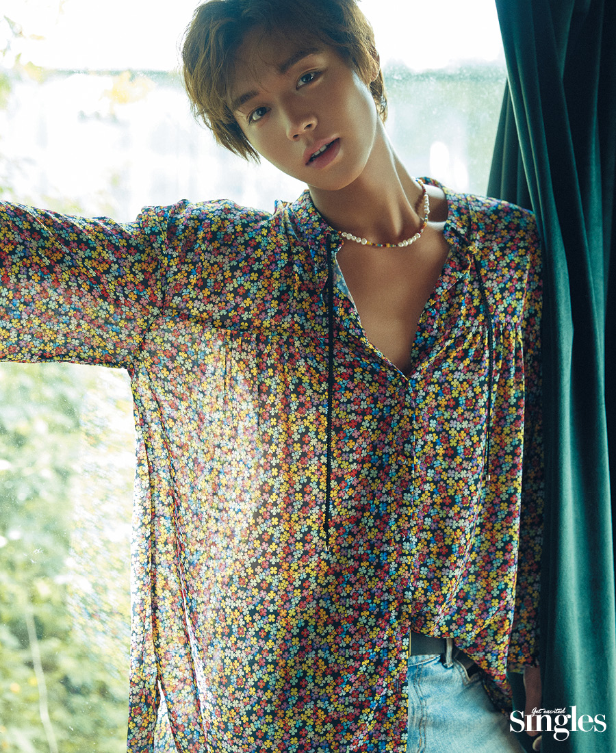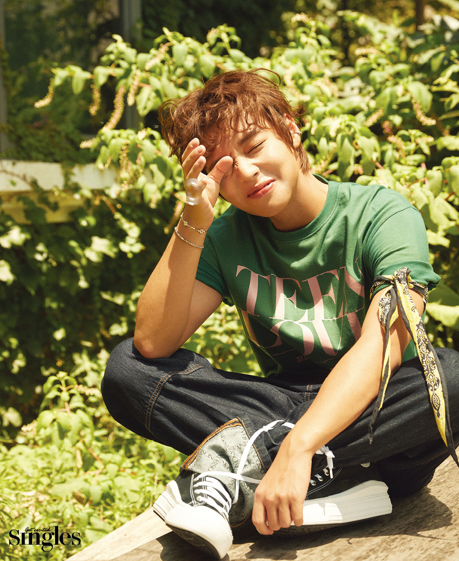 <싱글즈> 인터뷰 촬영 전날, 민트 컬러의 시원한 진정 팩을 얼굴에 올렸던 그는 이른 오전임에도 불구하고 부기 없는 쫀쫀한 피부를 자랑했다. 풋풋한 청춘들의 이야기를 그렸던 드라마 <멀리서 보면 푸른 봄>의 ‘여준’처럼, 하얗고 말랑한 이미지를 상상했던 것이 무색했다. 밝은 갈색으로 건강하게 그을린 피부가 ‘엇’ 하는 탄성을 일으켰다.
