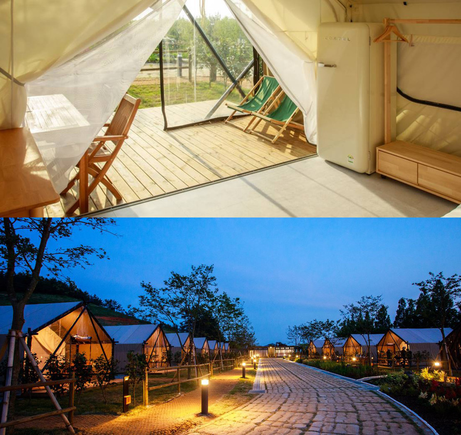 풍경 좋기로 소문난 파머스 빌리지에서 글램핑장을 마련했다. 지난 6월 문을 연 글램핑장은 데크 포함 12평 규모로 2개의 더블 침대와 냉장고, 공기청정기 등으로 구성되어 있다. 글램핑도 글램핑이지만 전라북도 고창의 상하농원에서 즐길 수 있는 여러 경험 또한 이곳을 방문하는 이유가 된다. 양떼목장과 유기농 아이스크림, 치즈, 빵 등을 만드는 액티비티를 함께 즐기면 심심할 겨를이 없다. 식사는 BBQ를 준비해 가거나 신선한 식재료가 가득한 농원식당과 상하키친을 이용할 수 있다.