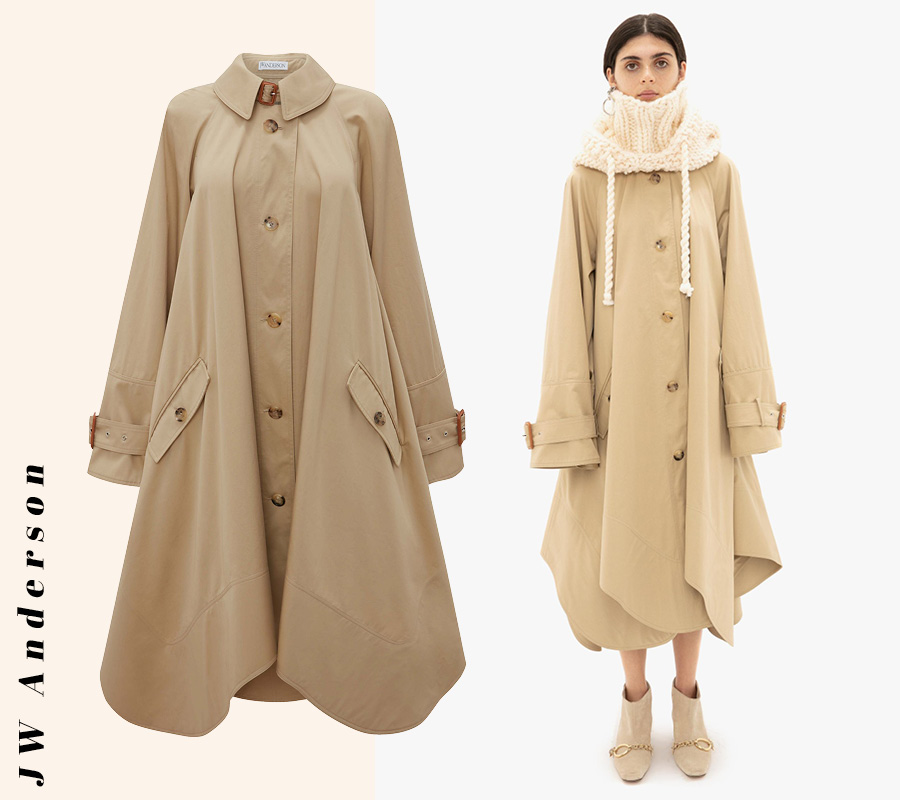 길에서 비슷한 옷차림의 사람을 마주치는 일만큼 민망한 경우도 없다. 그렇다고 베이지색 트렌치코트가 가진 갖가지 매력을 포기할 수도 없다면, 이번 기회에 색다른 디자인에 도전해보는 것은 어떨까. JW 앤더슨의 코튼 소재 트렌치코트는 아래로 갈수록 넓게 퍼져 드레스 같기도, 케이프 같기도 하다. 크게 굴곡진 헴 라인 덕분에 마치 커다란 꽃봉오리 안에 있는 것처럼 보이기도 한다.