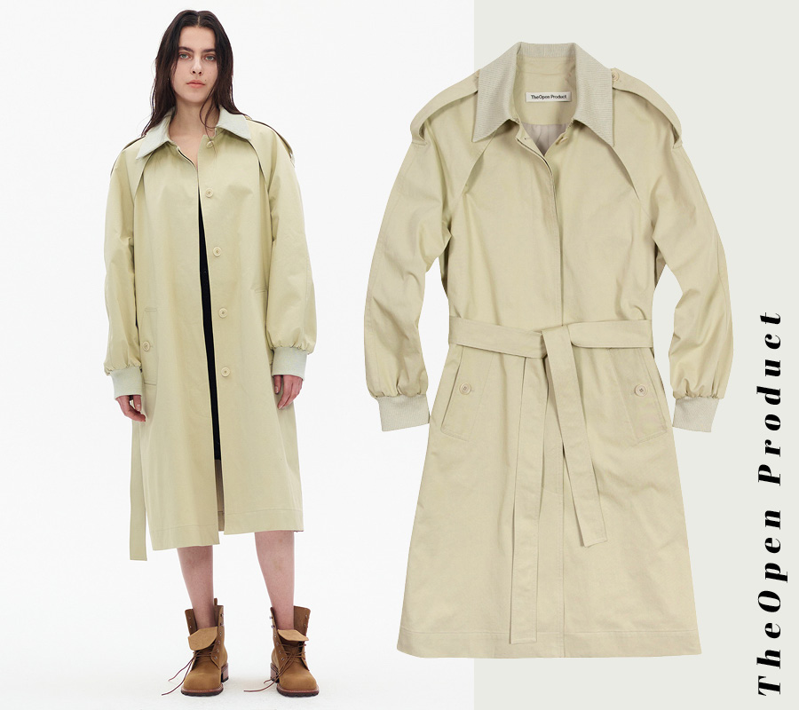 더오픈 프로덕트는 제니, 김나영 등 옷 좀 입는다는 국내 패션 아이콘은 물론 톱모델 켄달 제너까지 사랑하는, 그야말로 ‘요즘’ 브랜드다. 그래서인지 트렌치코트도 남달라 보인다. 언뜻 여느 트렌치코트와 비슷해 보이지만, 옐로 톤이 강조된 색과 스웨트셔츠를 연상케 하는 밴딩 소매와 칼라 디자인이 경쾌한 분위기를 연출한다. 기존 코트들에 비해 뒷면 슬릿도 깊은 편이다.