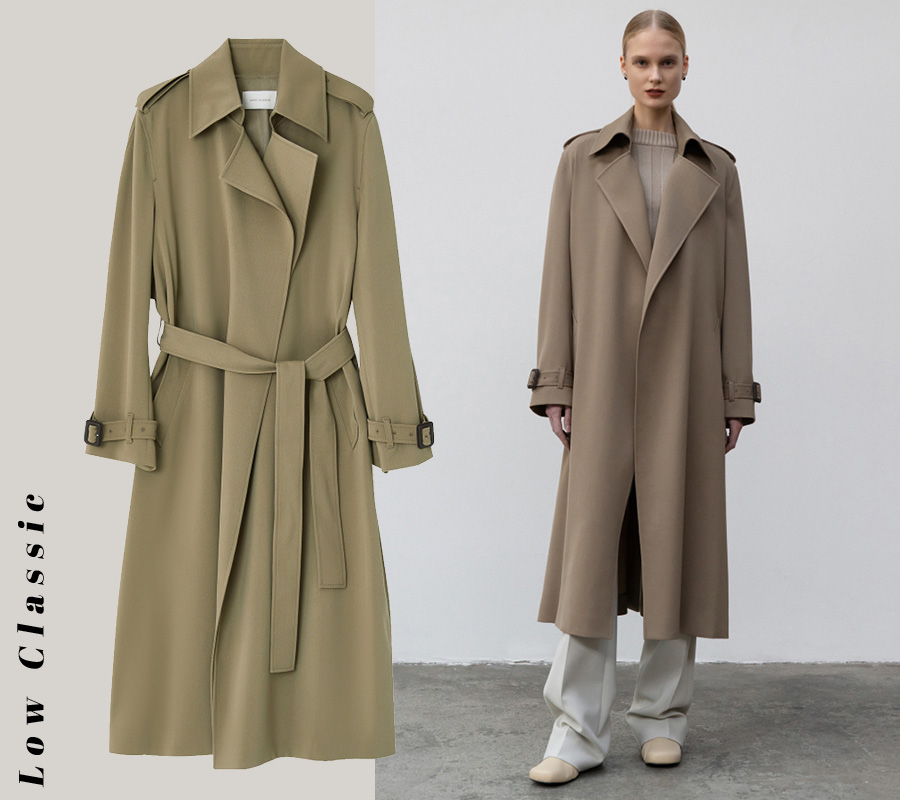 간결한 디자인을 찾고 있다면 로우클래식을 추천한다. 국내 디자이너 브랜드 중 베이식 아이템을 가장 유연하게 다루는 터라 실패 확률이 거의 없다. 이번 시즌 트렌치코트는 군더더기 없는 롱&린 실루엣을 바탕으로 옅은 카키 빛을 얹어 한층 고급스러운 느낌이다. 단추 디테일을 전부 생략해 코트를 여미고 싶을 땐 허리 스트랩을 활용해야 하는 번거로움이 있지만, 그마저도 우아하다.