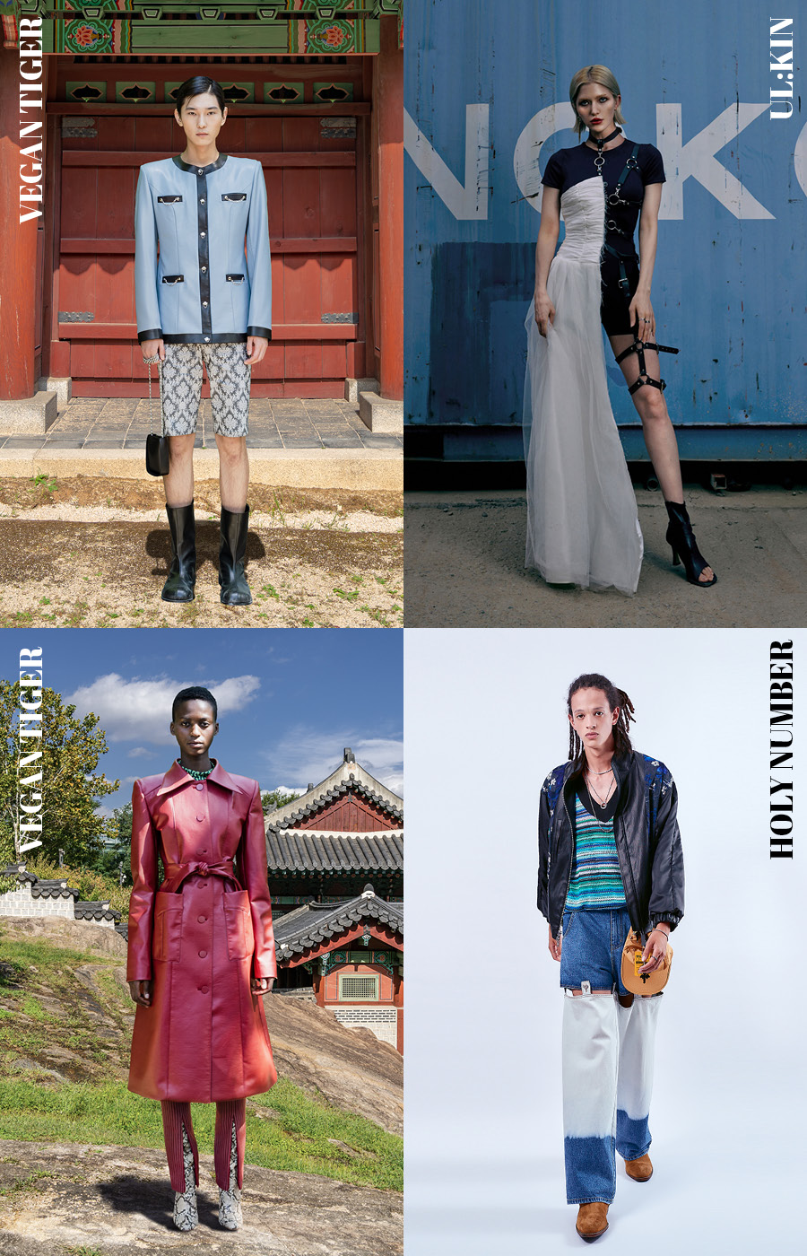 환경오염을 막는 가장 손쉬운 방법은 단연 생산을 멈추는 거겠지만, 우리는 언제나 새로움에 목말라 있지 않나. 간극을 최소화하기 위한 노력이 지금 환경보호를 위해 취해야 할 태도다. 해외에서는 이미 활발한 친환경 움직임이 국내 브랜드에서도 발견된다. 비건 타이거는 ‘지구인 패션쇼’라는 주제로 식물성 소재와 리사이클 소재를 사용했다. 사회가 요구하는 규율에 얽매이지 않는 아나키한 감성의 1980년대 뉴로맨틱 스타일이 주를 이룬다. 얼킨은 실제 회화 작품을 업사이클링한 가방을 시그너처 아이템으로 내세웠다. 신진 아티스트들과의 협업을 통해 재능 순환까지 실현되는 일석이조의 아이디어다. 제로웨이스트를 실천한 홀리넘버세븐도 있다. ‘변화는 우리 손에 달렸다’라는 캐치프레이즈의 연장선으로 친환경 소재를 최대한 활용했다.