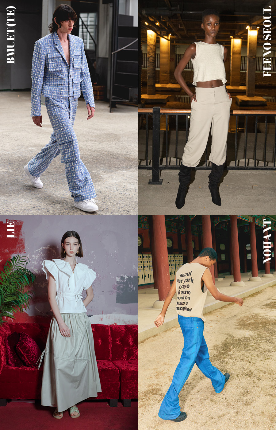 정답은 언제나 내면에 있다. 노앙, 라이, 비뮈에트, 프레노서울은 자신에게서 S/S 시즌에 대한 해답을 내렸다. 노앙은 브런치 룩 콘셉트를 업그레이드했다. 브런치를 먹으러 나가는 브랜드의 크루를 상상했다. 노앙 크루라면 분명 캐주얼한 스타일로 거리를 활보할 테니, 스포티 무드는 당연한 이야기일지도 모른다. 라이는 아름다운 시절을 의미하는 ‘벨에포크’를 주제로, 팬데믹 상황을 벗어나 이전의 생활로 돌아갈 수 있을 거란 믿음을 담았다. 비뮈에트는 일상적으로 경험해오던 방식을 벗어남으로써 내안의 또 다른 자아를 일깨운 컬렉션을 내놓았다. 로맨틱한 요소는 그대로다. 프레노 서울은 자신만의 페르소나를 만들고 살아가는 현대인의 다양성을 조명해 미니멀한 실루엣에 개성을 담았다.