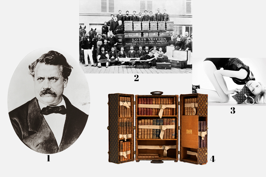 1 창립자 루이 비통의 포트레이트. 2 초창기 루이 비통의 모습. 직원들이 당시 대표 아이템인 트렁크와 함께 서있다. 3 건축가 프랭크 게리가 디자인한 모노그램 백. 4 어네스트 헤밍웨이를 위해 제작된 맞춤 트렁크.