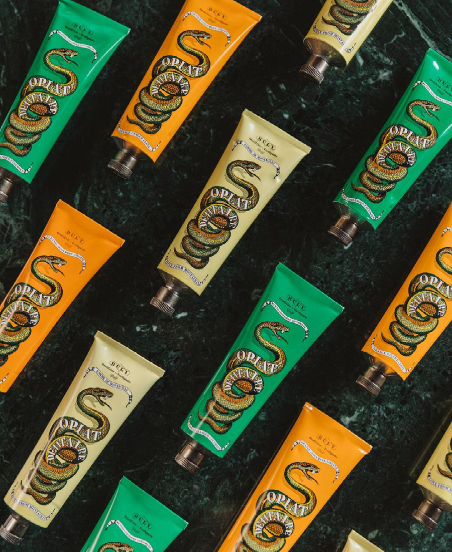 19세기 파리에서 시작된 불리 1803은 강렬한 패키지 디자인에서 느낄 수 있듯이 제조 방식부터 디자인까지 브랜드 전통의 방식을 고수하면서도 현대적인 재해석을 통해 모든 제품에서 특유의 고급스러운 클래식함을 엿볼 수 있다. 치약도 예외는 아니다. 아크릴 물감을 연상시키는 묵직한 튜브형 케이스 전면에 그려진 뱀 무늬는 단번에 눈길을 사로잡을 만큼 유니크한 매력이 있지만 천연 치약과는 사뭇 거리가 멀어 보인다. 그러나 막상 사용해보면 다르다. 가장 큰 반전 포인트는 불리 1803 치약만의 독특한 향과 맛에서부터 나온다. 민트, 솔잎 향이 주를 이룬 기존의 치약과 달리 불리 1803 치약은 패키지 컬러와 일치하는 원료의 향과 맛을 담았다. 몽토방은 상큼한 사과 향과 맛이 은은하게 퍼져 3종 중 가장 호불호 없이 사용할 수 있다. 뒤이어 출시된 진한 초록색의 오피아 당테르 몽트 코리앙드르 콩콩브르는 민트, 고수, 오이 향으로 청량함을 강조했고, 오렌지 컬러의 오피아 당테르 오랑쥬 진젬브르 지로플은 오렌지, 생강, 정향 향이 첨가돼 상쾌한 마무리감이 특징이다. 불리 1803 치약은 액세서리 캡에서도 차별화를 두었다. 고대의 수도꼭지에서 영감을 받은 별 모양의 부숑 로비넷을 결합하면 인테리어 효과는 극대화 된다. 불리 1803 오피아 당테르 몽트 코리앙드르 콩콩브르 75ml 3만9000원.