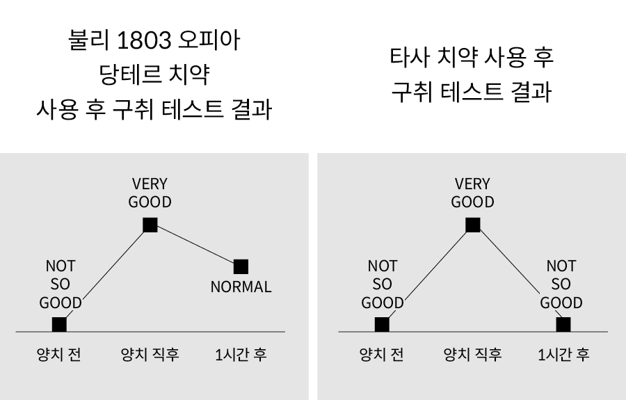 일반 치약과 비교했을 때 어떤 점이 다른지 구취 제거, 구강 건조함 개선으로 나누어 비교해봤다. 0단계인 VERY GOOD부터 1단계 NORMAL, 2단계 NOT SO GOOD, 3단계 BAD, 4단계 VERY BAD까지 총 5단계로 나뉜 구취 측정기로 양치 전, 직후, 1시간 뒤를 체크해 봤다. 불리 1803 치약은 양치 후 1시간 뒤까지 구취 1단계를 유지한 반면 일반 치약은 양치 전인 0단계로 돌아왔다.