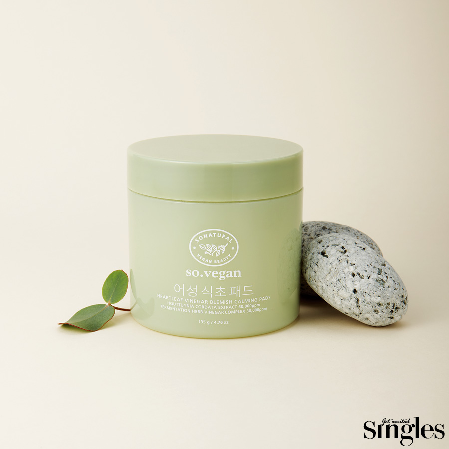 쏘내추럴 쏘 비건 어성 식초 카밍 패드 피부에 부드럽게 밀착되는 패드에 제주산 어성초 60,000ppm을 담았다. 한약재를 달이듯 저온에서 30분, 80℃ 이하에서 1시간 추출해 유효 성분 파괴를 줄였다. 현미를 1년 이상 발효한 흑초와 라벤더, 로즈메리, 티트리 3가지 허브를 배합해 문제성 피부를 완화하고 피부결을 매끈하게 정돈한다. 70ea 2만4000원.