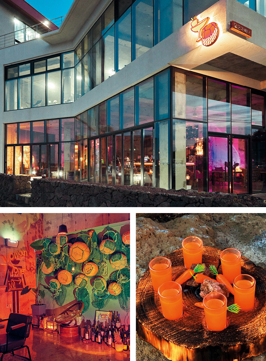 10시간 동안 수비드한 흑돼지 수육 위에 성게, 전복, 딱새우완자, 뿔소라 등을 올렸다. 눈과 입을 사로잡는 각종 당근술을 안주 삼으면 더욱 술술 넘어간다. 구좌 당근으로 만든 당근주스와 테킬라를 페어링한 당킬라는 시그너처 메뉴로 6잔 세트로 구성되어 있어 친구들과 나눠 먹기 좋다. 당근 막걸리 칵테일도 이곳에서만 맛볼 수 있는 특별한 술이다. 당근과 해녀는 노을이 예쁘기로 유명한 동쪽에 위치하고 있다. 저물녘 찬란하게 물드는 하늘을 감상하고 난 뒤 이곳에서 여흥을 즐겨보자.