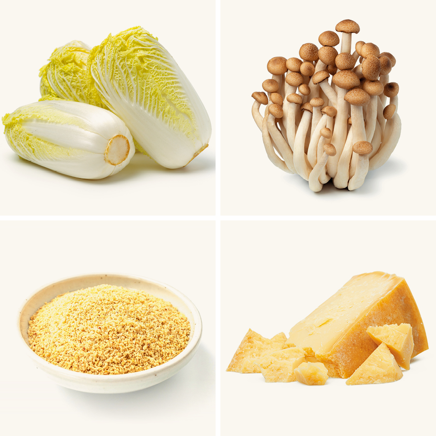 재료 알배추 1/4개, 맛타리버섯 50g, 새송이버섯 1개, 표고버섯 3개, 대파 30g, 간 생강, 그라나파다노 치즈, 황두장, 설탕, 생크림, 들깻가루