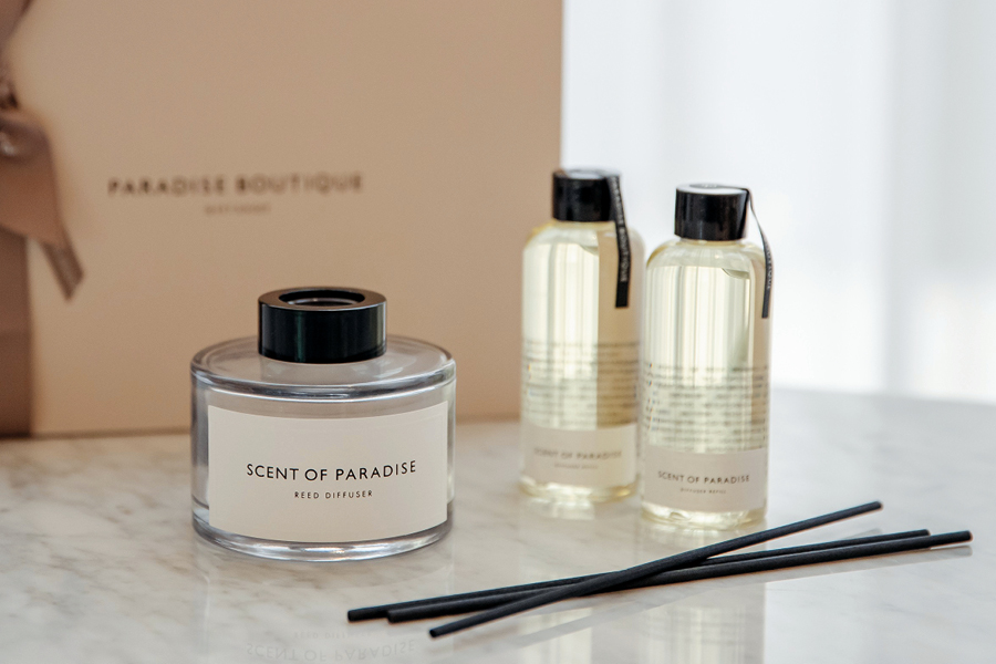 오직 파라다이스시티 내에서만 구입할 수 있는 디퓨저 ‘센트 오브 파라다이스’. 파라다이스시티에 들어서면 가장 먼저 피부에 와닿는 향을 그대로 담았다. 센트 오브 파라다이스는 파라다이스 그룹이 향 시스템, 디퓨저, 고품질의 에센셜 오일, 아로마 오일을 제조하는 글로벌 기업 ‘에어 아로마’와 6개월간의 협업을 거쳐 개발한 제품이다.