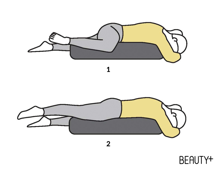 1 세로로 둔 폼롤러의 왼쪽에 엎드려 왼 다리는 길게 펴고, 오른 다리의 무릎을 직각으로 구부려 서혜부를 폼롤러 위에 올려놓는다.