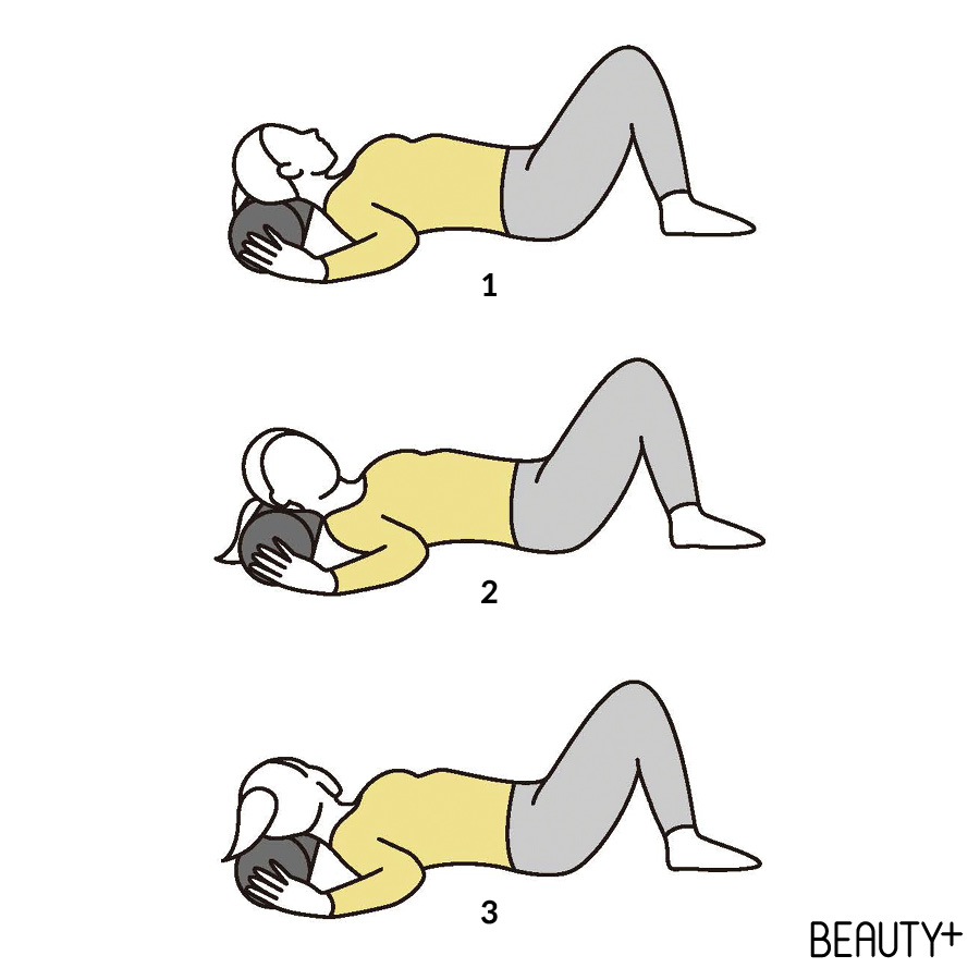 2 양손이 움직이지 않도록 지지하고, 발끝으로 바닥을 밀며 공을 위아래로 굴려준다. 양손은 고정한 채 팔꿈치의 각도만 조절하며 움직인다. 어깨를 최대한 아래로 멀게 떨어진 상태를 유지하고, 머리가 바닥으로 처지지 않게 움직인다.