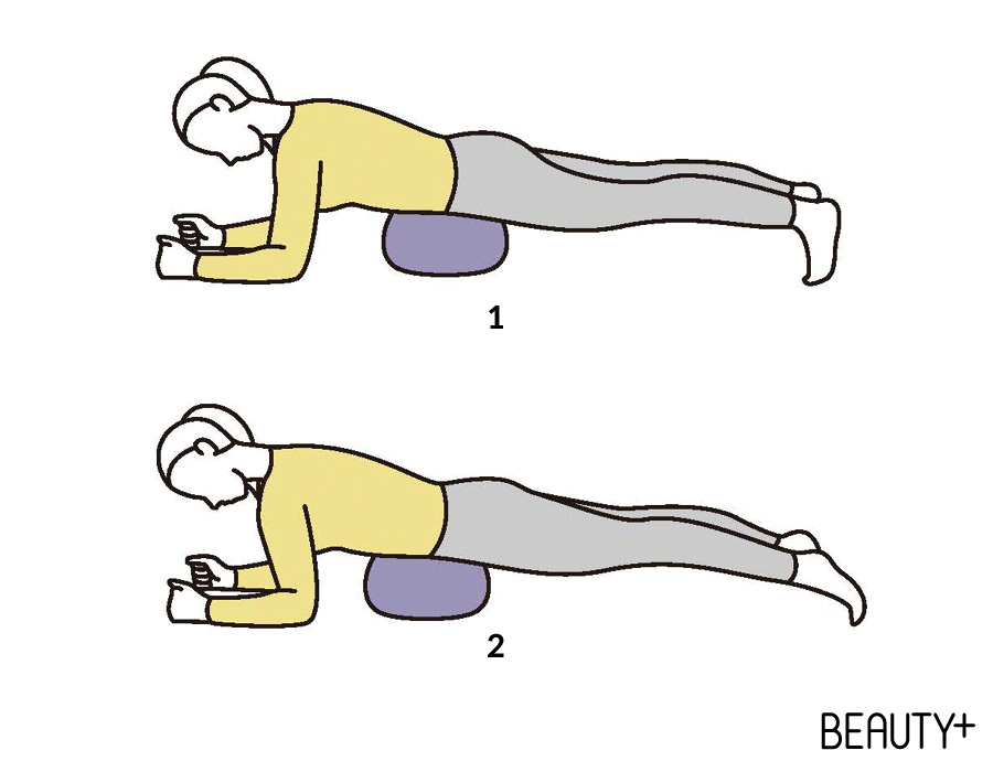 1 하복부에 축구공 크기의 고무공을 위치시켜 엎드리고, 다리를 길게 뻗어 발끝으로 바닥을 지지한다. 팔꿈치를 직각으로 접어 바닥에 대고 양손은 주먹을 쥐고 준비.