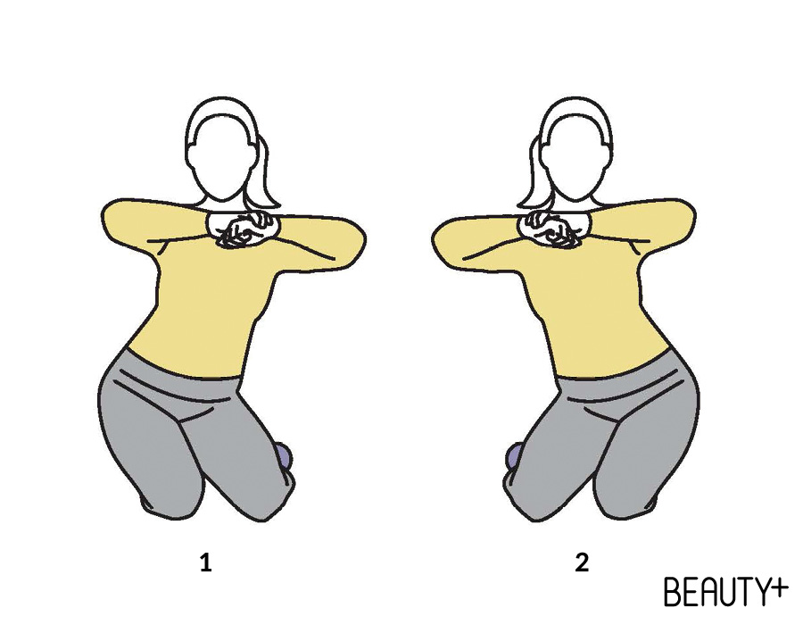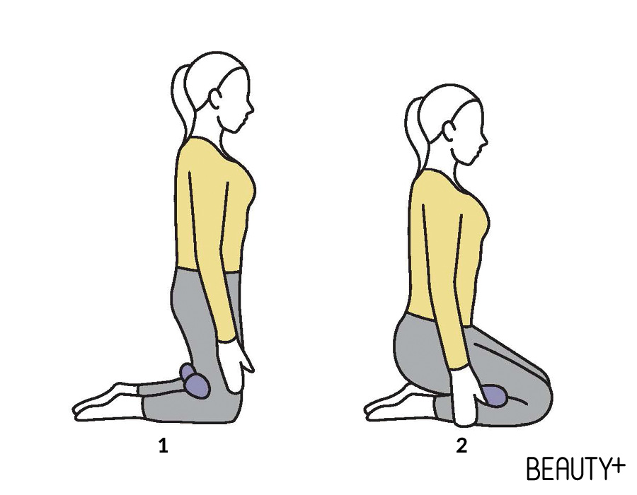 1, 2 무릎 뒤 오금 부분에 테니스공 크기의 공을 끼우고 무릎을 꿇고 앉는다. 무릎과 무릎 사이에 주먹 한 개가 들어갈 정도로 벌리고 준비. 양손을 맞잡은 상태로 어깨높이로 들어 균형을 잡는다. 엉덩이를 좌우로 움직이며 오금과 종아리, 허벅지에 전체적으로 자극을 느낀다. 몸통이 크게 흔들리지 않도록 천천히 시행한다.