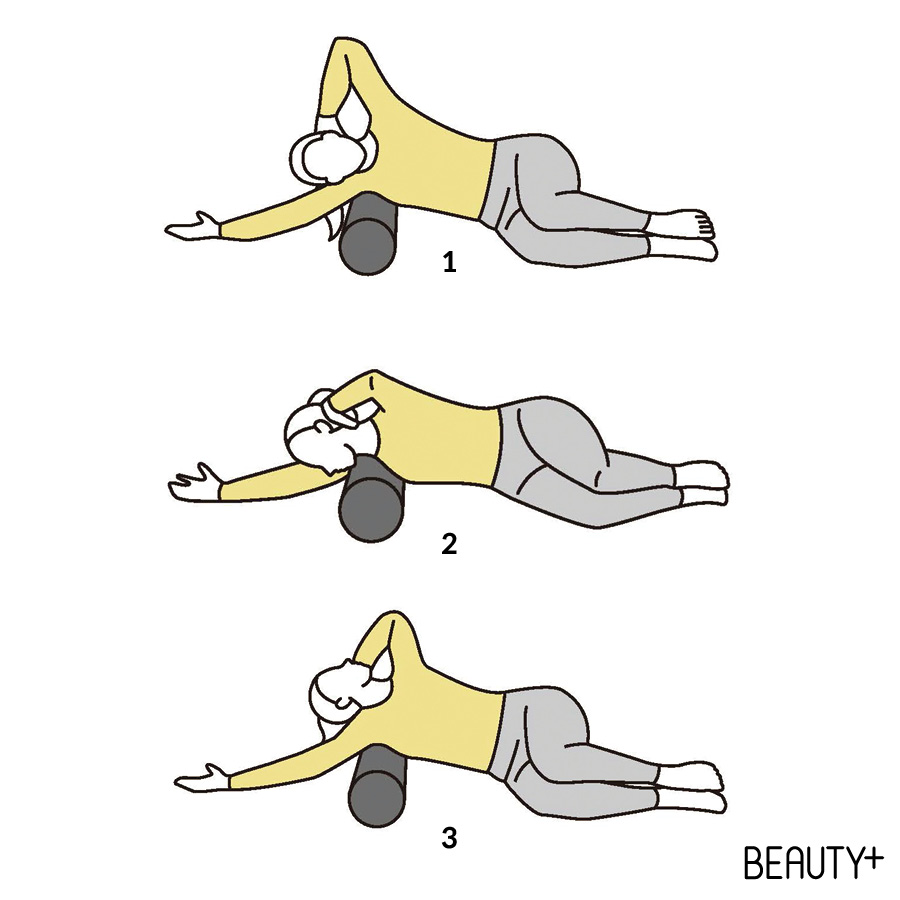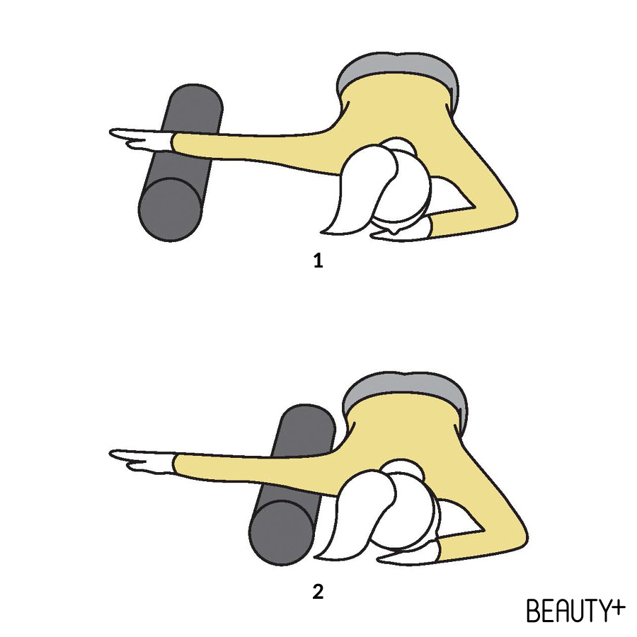 2 몸통을 좌우로 움직이며 팔로 폼롤러를 넓은 범위로 굴려준다. 팔에 약간의 압력을 가해 지그시 눌러주며 반복한 뒤, 반대 방향으로 똑같이 진행한다.