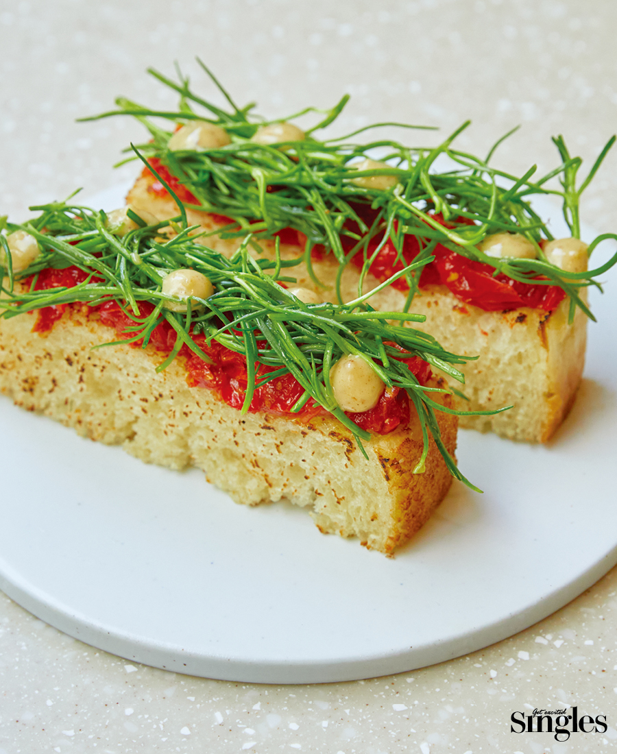 재료 사워도우(또는 바게트빵) 슬라이스 2개, 방울토마토 20알, 세발나물 10g, 엑스트라 버진 올리브유, 마늘 1쪽, 레몬 웨지 1개, 소금·후추 약간씩