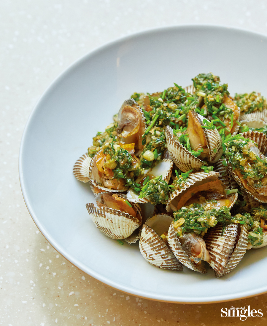 STEP5 잘 쪄낸 꼬막은 한쪽 껍데기만 벗겨서 먹기 좋은 모양으로 접시에 담고, 그 위에 치미추리 소스를 만든다.