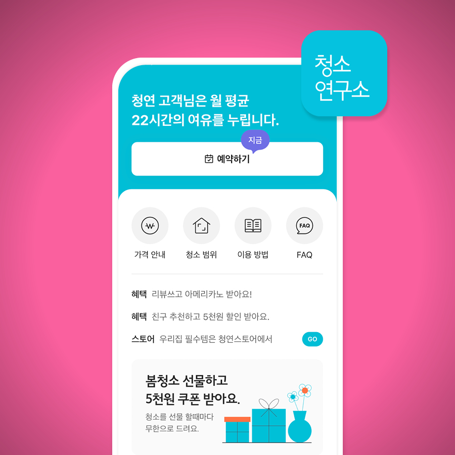 청소 연구소는 청소 매니저와 고객을 매칭해주는 플랫폼으로 다른 서비스 없이 청소에 집중한다. 인성 면접부터 이론 교육, 실습 교육까지 5단계의 꼼꼼한 검증 과정을 거친 매니저로 구성되어 있어 믿고 맡길 수 있다. 주방, 화장실, 방, 거실 등 각 영역별로 표준화된 청소 가이드에 맞춰 서비스가 진행된다. 1회 예약부터 정기 예약, 부분 예약도 가능하고 첫 청소일 경우, 5천원 할인 쿠폰이 제공된다. 예약부터 결제, 일정관리까지 애플리케이션에서 한번에 진행할 수 있다.