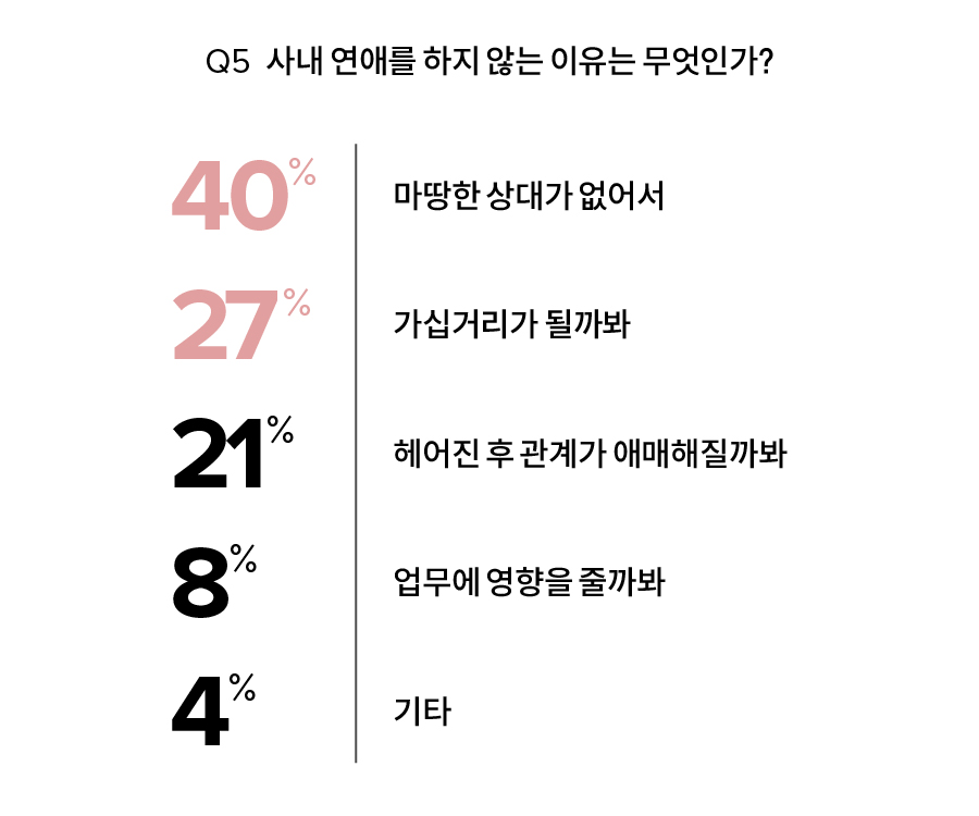 요즘 드라마를 보고 있으면 나도 모르게 사내 연애의 로망에 사로잡힌다. ‘배우 송강을 닮은 부하 직원이 고백 한다면?’ ‘부와 명예, 얼굴까지 완벽한 직장 상사가 내게 고백한다면?’ 일종의 망상에 가깝다는 걸 안다. 하지만 요즘 인기리에 방영되는 드라마는 자꾸 이런 기분 좋은 상상을 부추긴다. 드라마 <기상청 사람들: 사내연애 잔혹사 편> <사내맞선>을 비롯해 넷플릭스 오리지널 시리즈 <모럴센스>까지 로맨틱 코미디의 배경이 전부 사무 실이다. 후배, 동기, 상사와 달콤하고 아찔한 연애를 이어가는 전개를 보고 있자면 지금 내 옆의 동료가 원망스 러울 따름이다. 인생의 희로애락을 경험하는 분방한 인간관계의 현장인 사무실에서 왜 우리는 사랑을 찾을 수 없는 것일까? 나이와 연령, 성격과 외모까지 전부 다양한데 왜 사내 연애가 이뤄지지 않는지 모르겠다. 이런 궁금증은 비단 우리만의 것이 아니다. 마땅한 유혹이라 할 수 있을 만한 사건도 없었으니 나를 마음에 둔 상대도 없다는 의미다. <싱글즈>가 진행한 설문조사에 따르면 사내 연애에 대한 로망이 있는 사람은 27%에 불과했다.응답자의 73%는 사내 연애에 기대조차 없다고 해석할 수 있다. 하루 중 대부분의 시간을 보내며 가장 오래 함께하는 이 사람들이 미래의 내 연인으로 보이지 않는 까닭은 무엇일까? N년 차 직장인들이 들려주는 사내 연애의 이유 있는 함정에 대하여.