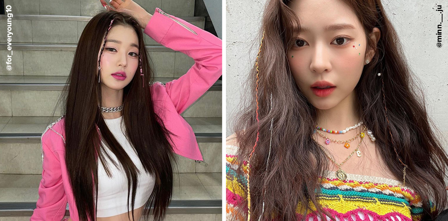 페스티벌과 가장 잘 어울리는 헤어는 단연 브레이드 헤어다. 그중에서도 컬러풀한 직물과 머리를 함께 땋은 익스텐션 브레이드는 자유로운 보헤미안 스타일을 완성하는 최고의 액세서리 역할을 한다. 익스텐션 브레이드 특유의 화려함 덕분일까 페스티벌 외 여자 아이돌들 사이에서도 핫하게 떠오른 듯하다. 장원영은 핫핑크 컬러의 옷과 색깔을 맞춘 핑크 컬러의 브레이드 헤어로 포인트를 줬고 김민주는 무지갯빛 직물과 머리를 촘촘하게 땋고 여러 개의 네크리스와 레이어드해 익스텐션 페스티벌 룩의 정석을 보여줬다. 일반 브레이드 헤어와 다르게 익스텐션 브레이드는 소량의 모발과 실을 교차해 풀리지 않도록 땋아야 하기 때문에 꼼꼼하게 엮는 것이 핵심이다. 룩의 마무리로 컬러감 있는 액세서리와 함께 매치하면 매력이 배가 되니 참고해 보자.