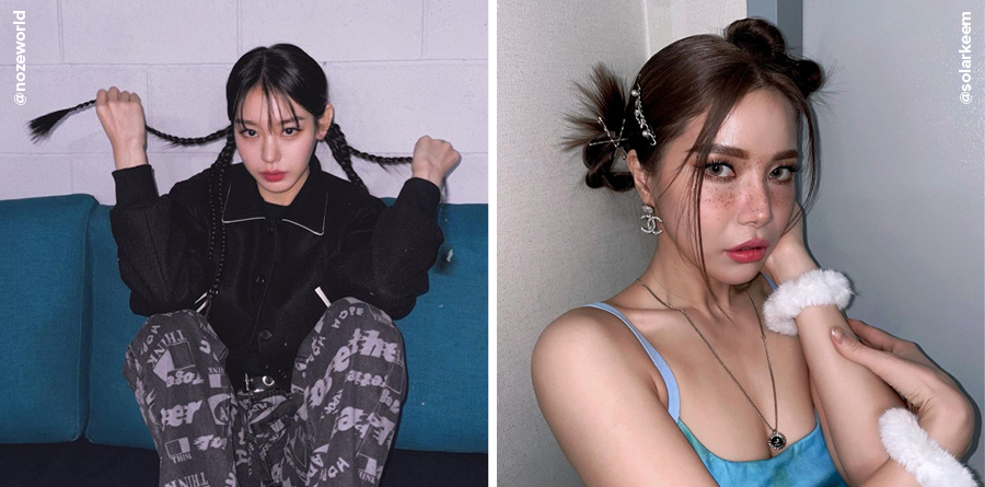 브레이드 헤어는 요즘처럼 덥고 습한 계절에 시도하기 좋다. 물놀이나 운동처럼 땀에 젖고 움직임이 많을 때 흐트러짐 없는 멋을 유지할 수 있을 정도로 고정력이 강할 뿐 아니라 풀리는 대로 그만의 자연스러운 멋이 느껴지기 때문. 격한 춤을 추는 아티스트들 사이에서 브레이드 헤어가 자주 포착되는 이유다. 노제와 솔라는 단순한 브레이드에서 벗어나 세 갈래 땋기부터 두 가닥을 꼬아 묶는 트위스트 브레이드까지 다양한 변형을 시도했다. 멀티 브레이드 헤어에 시스루 뱅을 내 펑키하면서도 귀여운 느낌을 연출한 노제에 이어 솔라는 앞머리를 길게 뺀 후 헤어핀을 매치해 여성스러운 무드를 한껏 살린 대신 주근깨를 강조한 메이크업으로 말괄량이 같은 귀여운 느낌을 한 스푼 가미했다. 이처럼 브레이드 헤어는 복잡하고 화려하게 연출할수록 배배 꼬인 브레이드 헤어만의 텍스처를 근사하게 살릴 수 있다는 장점이 있다.