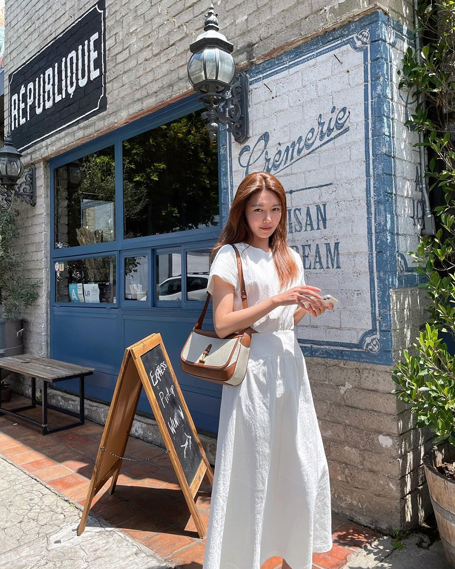 피크닉에 가기 전, 무엇을 입을까 고민이 많을 것이다. 도저히 떠오르지 않는다면 가장 보편적인 것이 최고의 선택이 될 것이다. 그중 하나가 화이트 컬러 롱 원피스다. 청순함을 강조할 수 있음은 물론, 긴 치마 길이 덕분에 활동성도 좋다. 수영이 이 코디를 기가 막히게 소화했다.