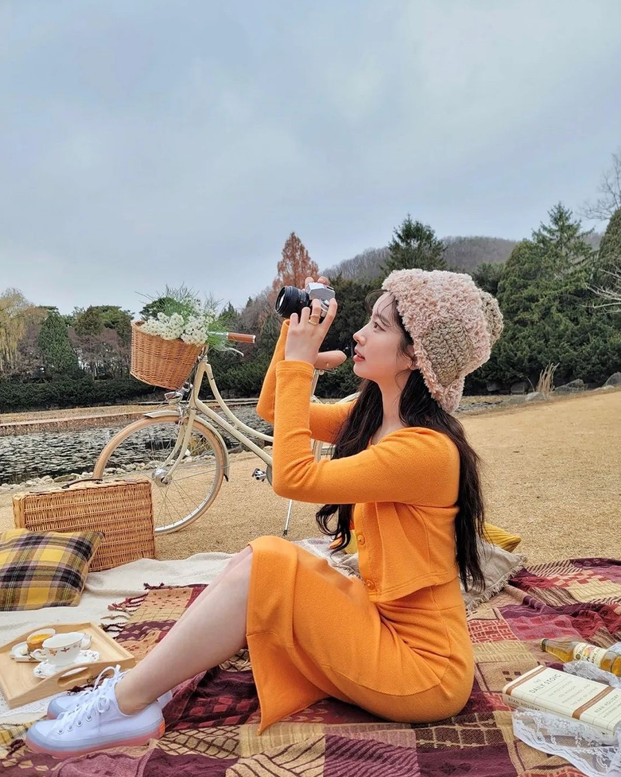 자신의 개성을 보여주기를 원한다면 컬러 포인트가 명확한 셋업 혹은 원피스를 입어보자. 화이트 원피스와는 다른 매력을 보여준다. 더욱이 요즘처럼 파릇파릇함이 돋보이는 배경이 내가 입은 옷과 어울리면 인생샷을 건질 수 있다. 트와이스 다현이 입은 오렌지 컬러의 셋업을 보자. 명확한 존재감을 뽐내면서도 배경에 녹아든다.