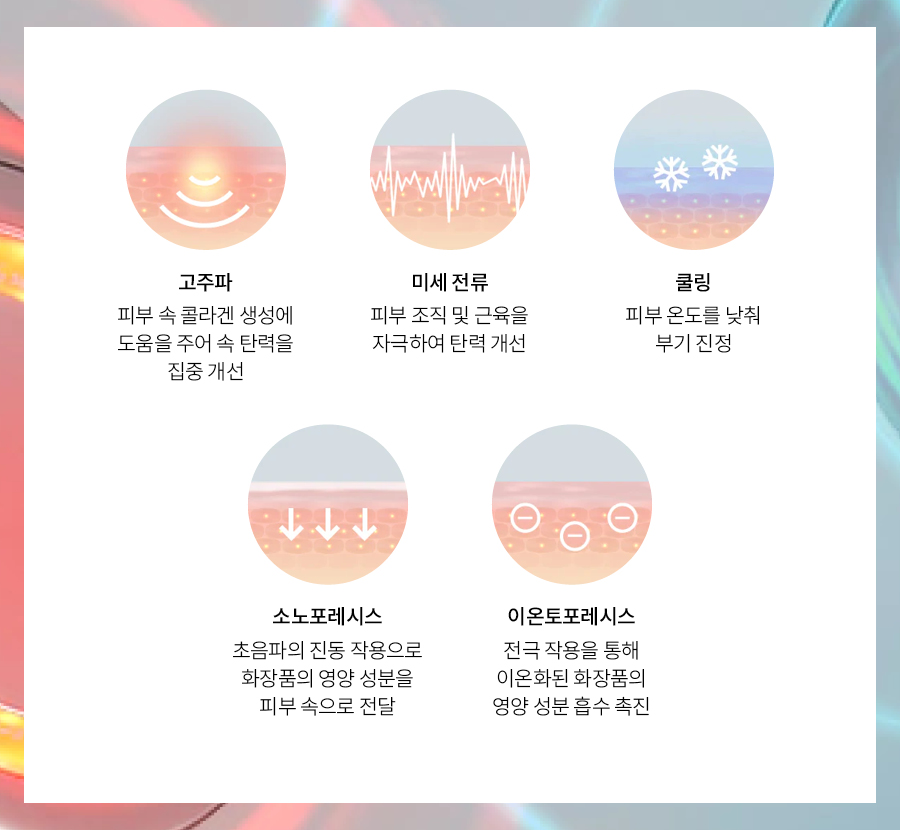 먼저 고주파는 피부 진피층까지 도달해 속 탄력 개선에 도움을 주고, 콜라겐과 같은 물질 생성을 촉진시킨다. 여기에 250마이크로 암페어 수준의 미세 전류가 만나면 피부 조직과 근육을 자극해 겉과 속의 탄력을 동시에 끌어올리기에 효과적. 저주파 진동을 활용하는 소노포레시스는 피부 각질층을 미세하게 흔들어 화장품 영양 성분의 흡수를 돕고, 이온토포레시스는 전극의 힘으로 수용성 화장품이 피부 속 깊숙한 곳까지 도달할 수 있도록 한다. 각각의 기술은 표피부터 진피 하단부까지 작용하는 깊이가 달라 동시에 사용하면 피부 조직 전체에 짧은 시간 안에 고르게 전달될 수 있어 효과가 높아진다. 마지막은 쿨링이다. 외부 자극으로 인해 달아오른 피부의 온도를 저온 테라피로 낮추고, 모공은 축소시켜 피부 결을 매끄럽게 만든다.