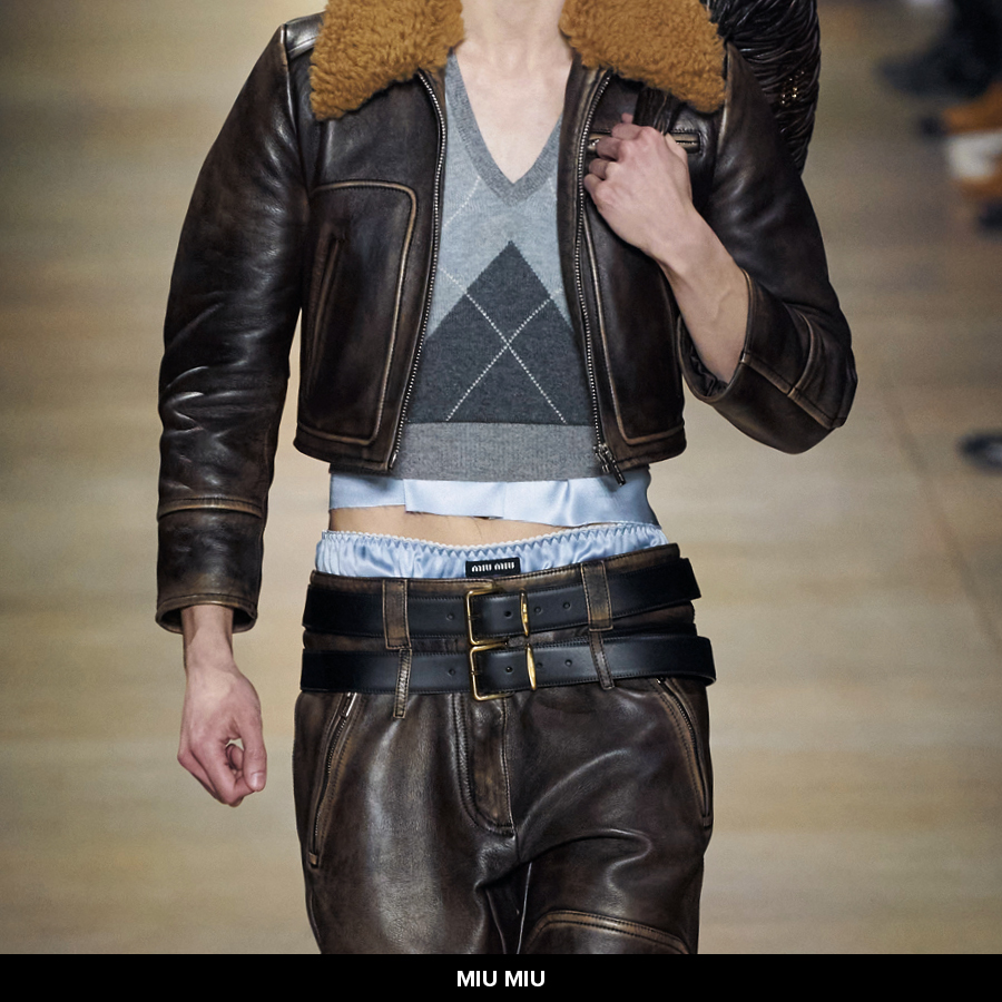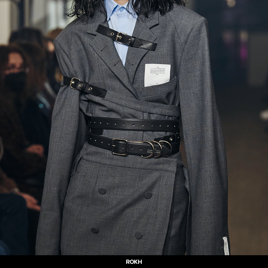 벨트를 겹겹이 스타일링하는 것이 뉴 시즌의 트렌드로 떠올랐다. 묵직해진 골반 위로 잘록한 허리를 드러내볼 것.