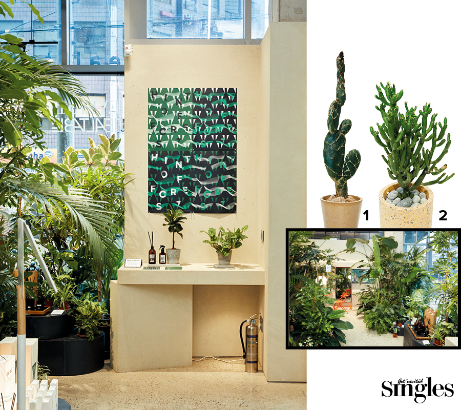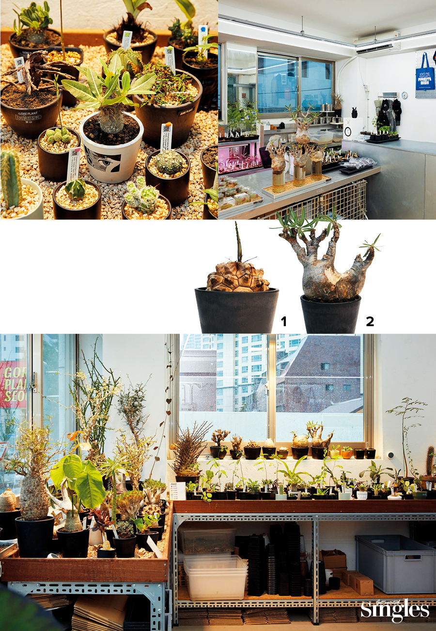 '고어(gore)하다’의 그 고어가 맞다. 이름도 식물의 모양새도 특이한 고어플랜트서울은 아프리카에서 온 괴근식물을 중점적으로 소개하는 플랜트숍이다. 덩어리 ‘괴’에 뿌리 ‘근’을 쓰는 이 희귀한 식물은 일반적으로 식물 하면 떠오르는 큰 이파리나 긴 줄기를 전혀 찾아볼 수 없다. 안봉환 대표는 괴근식물 고유의 둔탁한 무게감과 이국적인 매력에서 어디든 ‘툭’ 하고 가볍게, 그러나 멋있게 둘 수 있는 오브제로서의 가능성을 찾았다. 성장이 더디면서 키우기 쉬운 괴근식물의 특징도 이를 뒷받침했다. 검정 화산석으로 식물을 장식하거나, 직접 제작한 스테인리스 매대를 배치하는 등 쇼룸 곳곳에서 고어플랜트서울만의 톤과 색감이 드러난다.