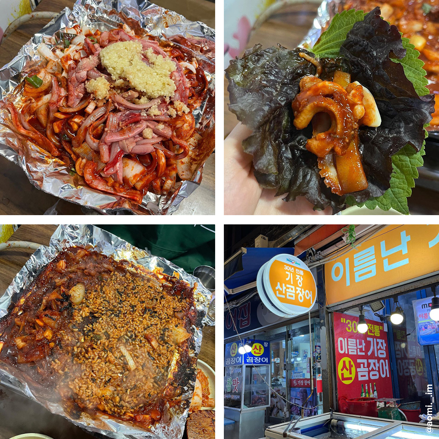 해운대 전통시장 골목에 위치한 이름난 기장산 곰장어는 주문과 동시에 살아있는 곰장어를 그 자리에서 잡아 요리하는 것이 특징이다. 통구이, 양념구이, 소금구이 세 가지 방법으로 요리하며 고추장 양념에 버무린 곰장어에 다진 마늘을 얹어 내는 양념구이가 특히 인기다. 곰장어와 함께 익어가는 마늘이 알싸하면서도 달달한 감칠맛을 더한다.