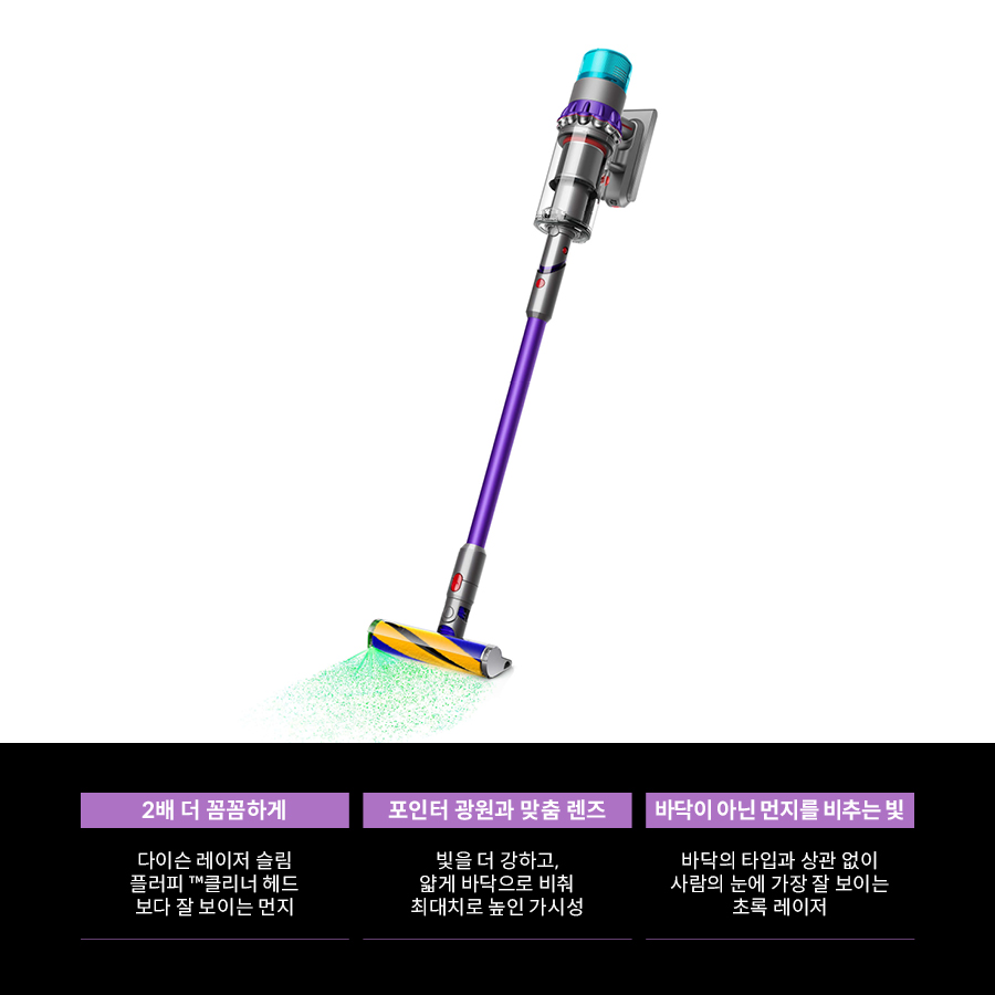다이슨 V12 디텍트 슬림™이 출시됐을 때, 바닥의 먼지를 비추는 레이저는 말그대로 센세이션한 이슈였다. 먼지를 눈으로 직접 확인하고 청소할 수 있어 ‘청소를 하고 싶게 만드는’ 청소기라는 별명도 얻었다. 다이슨 젠(Gen)5 디텍트™의 새로운 플러피 옵틱™ 클리너 헤드는 기존 대비 2배 더 잘 보이는 빛을 구현했다. 빛이 더 강해졌을 뿐 아니라 밝아졌기 때문. 초록색의 빛은 바닥의 타입과 상관없이 먼지를 가장 잘 보여준다. 특수 제작된 렌즈로 빛이 통과하면, 지면으로부터 7.3mm 떨어진 높이에서 부채 형태로 멀리 퍼뜨려준다. 보통의 눈으로는 잘 보이지 않던 먼지들까지 포착할 수 있게 되는 것이다.
