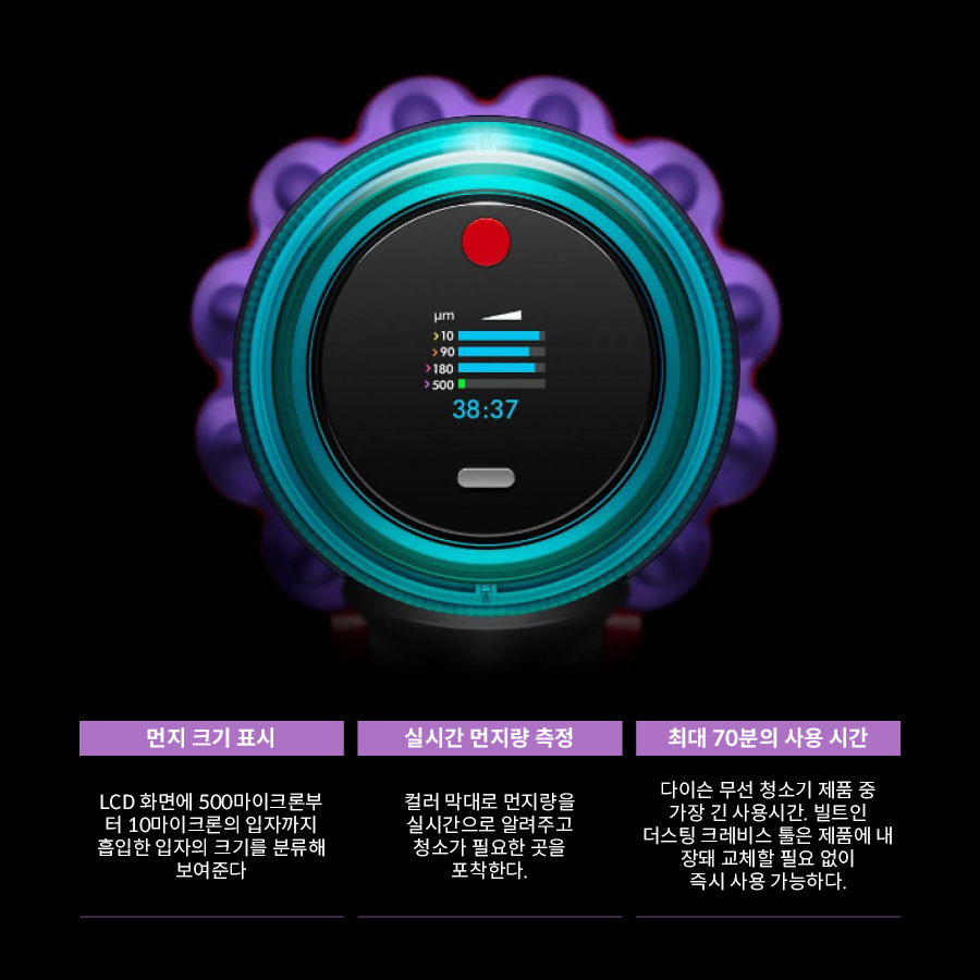 다이슨 젠(Gen)5 디텍트™의 사용자 인터페이스는 완전히 새롭게 설계됐다. 이전 모델에서도 LCD를 통해 바닥의 먼지량과 흡입된 먼지를 확인할 수 있었지만, 이번 모델에서는 실시간으로 제거되는 먼지량을 보여준다. 500마이크론부터 10마이크론의 아주 미세한 입자까지 분류해 확인할 수 있다. 또 다이슨 무선 청소기 가운데 가장 긴 시간인 최대 70분 간 사용할 수 있는 배터리가 탑재됐다. 에너지 밀도가 높은 고성능 10셀 리튬 이온 배터리 덕분이다. 핸디형 청소기로 사용할 수 있는 더스팅 크레비스 툴은 제품에 내장돼있어서 원터치로 변환이 가능해 보다 손쉬운 청소 환경을 만들어준다.