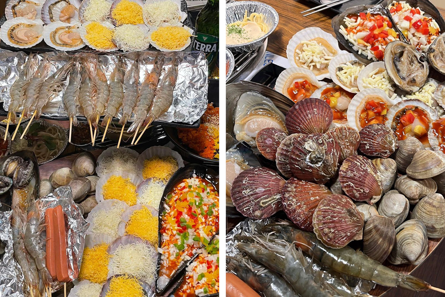 실속 있는 구성을 자랑하는 ‘쪼개’. 애피타이저로 토마토와 크림 파스타가 나와 후각을 자극한다. 큼지막한 키조개 관자, 치즈가 올라간 가리비와 전복은 노릇노릇하게 구워지면 함께 먹도록하자. 싱싱한 새우와 소시지는 타지 않게 호일 위에 올려 구워 먹으면 된다. 직접 구운 치즈와 소스를 같이 곁들이면 더욱 맛있게 즐길 수 있다.