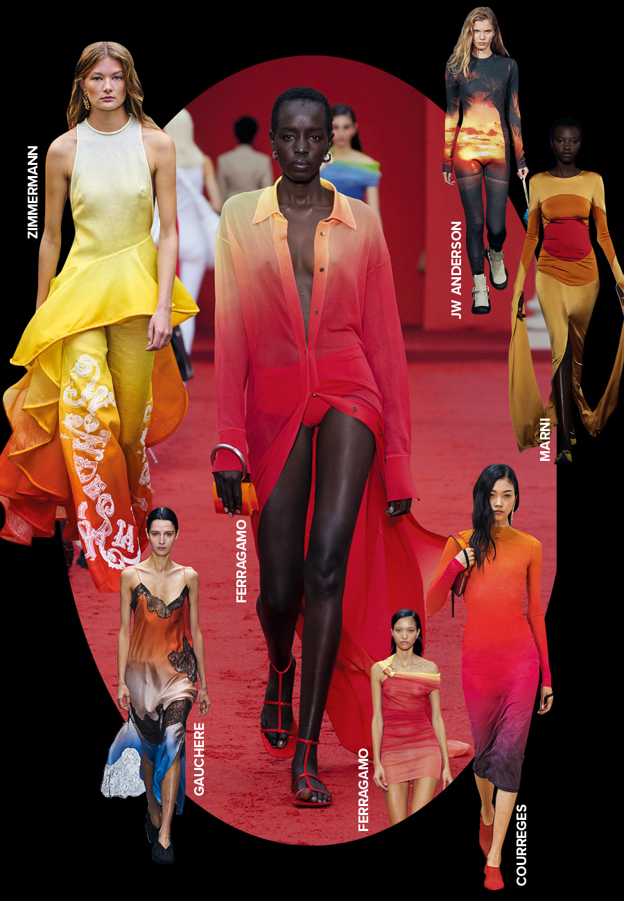 붉은 노을이 세상을 물들이는 그때. 제 할 일을 마치고 마지막 순간까지 피어오르는 태양의 모습에서 디자이너들은 긍정의 기운과 낭만을 발견한 듯하다. 살바토레 페라가모, 짐머만, 꾸레쥬 등 몇몇 컬렉션에서는 옐로, 오렌지, 레드처럼 노을을 연상케 하는 컬러 팔레트를 쇼피스 안에 담아 그 감동을 재현했다. 마치 한 폭의 그림을 보는 것 같은 착각을 불러일으킨다.