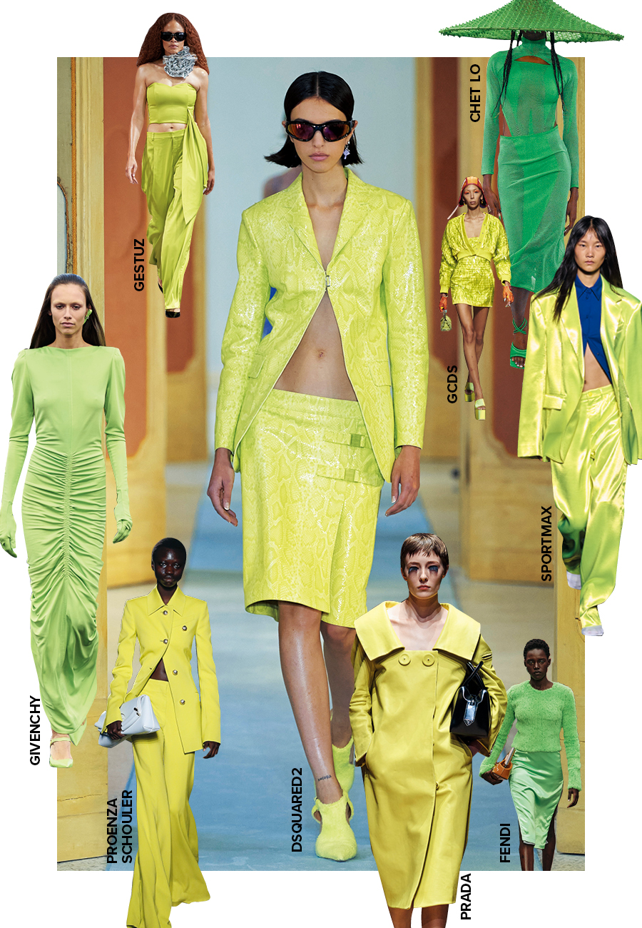 바이러스가 창궐하고 경제가 어려운 시대에도 패션에 대한 열정은 멈출 수 없다. 이번 시즌 디자이너들은 약속이나 한 듯 싱그러운 라임 컬러를 무대 위에 올렸다. 초록색에 노란색 물감을 몇 방울 섞은 묘한 인상의 라임 컬러는 평화와 조화, 활기를 담고 있어 봄의 에너지와 일맥상통한다. 쇼피스처럼 머리부터 발끝까지 올 라임으로 도배해도 좋겠지만, 다소 부담스럽게 느껴진다면 모노톤의 룩에 포인트 컬러로 사용하면 세련된 데일리 룩을 완성할 수 있다.