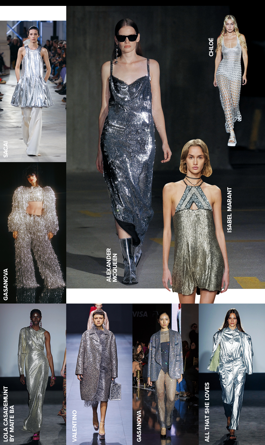 먼발치에서도 한눈에 알아볼 수 있을 만큼 반짝이는 메탈릭한 컬러를 런웨이에 수놓는 방법으로 말이다. 매끈한 텍스처가 미래적인 인상을 풍기는 드레스, 빛에 따라 다양한 매력을 드러내는 시퀸 블라우스와 팬츠, 크리스털을 촘촘하게 담은 재킷. 드레이프, 플리츠, 엠브로이더리, 네트 등 장식적인 소재를 접목해 한층 드라마틱하고 감동적인 순간을 연출한 지방시와 세실리아 반센. 글램 록이나 디스코풍이 아닌 미니멀한 1990년대풍으로 반짝이 컬러를 사용했다.