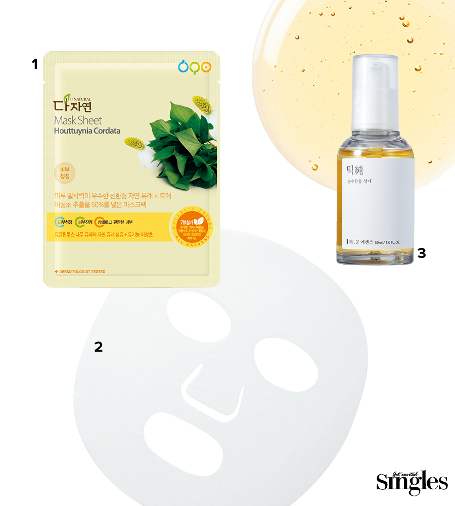 1 다자연 어성초 마스크팩 병풀 추출물이 피부를 진정시키고 고분자 히알루론산이 강력한 피부 수분막을 형성한다. 25g×30매 4만5000원. 2 원오세븐 아보카도 커들 시트 마스크 외부 환경으로부터 피부를 보호하는 아보카도 성분이 수분과 영양을 부여한다. 25g×5매 2만6000원. 3 믹순 콩 에센스발효한 콩을 사용한 쫀쫀한 텍스처로, 원료를 작은 입자로 쪼개 피부에 잘 스며든다. 50ml 3만5000원.