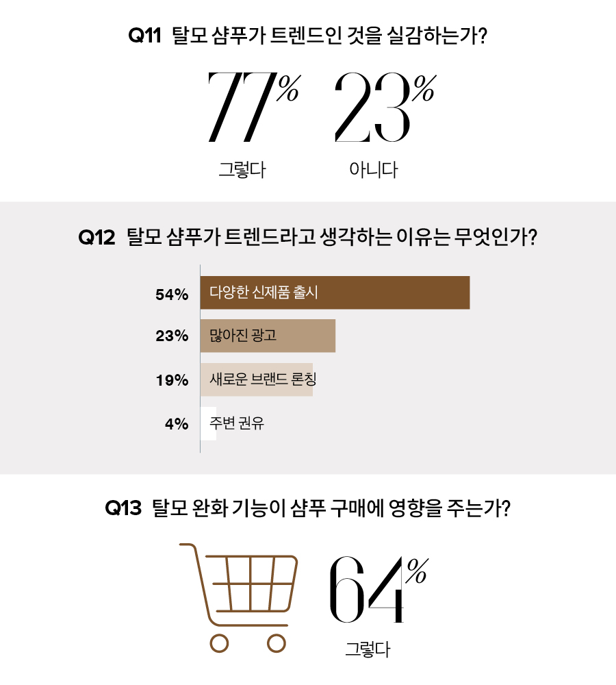 반면 탈모 케어 제품은 10명 중 7명이 사용해봤다고 밝혔다. 비교적 저렴한 가격에 손쉽게 사용할 수 있는 탈모 기능성 제품을 찾는 이들이 늘어난 것을 확인할 수 있다. 이에 따라 두피, 모발 케어 시장 또한 ‘탈모 방지’라는 기능성 효과가 매출에 직접적인 영향을 미치는 수준에 이르렀다.