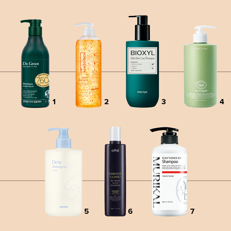1 닥터그루트 시카+바이옴 트러블두피용 샴푸 두피 진정과 유수분 밸런스 조절에 탁월한 시카와 바이옴 추출물로 완성된 시카+바이옴 콤플렉스가 두피 컨디션을 개선한다. 350ml 2만5900원. 2 닥터방기원 바이오틴 샴푸 탈모 완화에 효과적인 바이오틴 성분을 캡슐에 담아 건강한 두피로 케어하는 것은 물론 모발 끝까지 영양을 공급한다. 740ml 2만1000원. 3 마녀공장 바이옥실 안티 헤어 로스 샴푸 비타민 B 복합체인 바이오틴과 10가지 두피 강화 원료를 배합한 바이옥실 콤플렉스 성분으로 탄탄한 두피 건강을 완성한다. 480ml 3만3000원. 4 쏘내추럴 하트리프 비니거 헤어 로스 샴푸 어성식초와 식물성 레드 콜라겐 성분으로 완성된 조밀한 거품이 민감성 두피와 푸석한 모발을 동시에 케어한다. 500ml 2만8000원. 5 씨드비 이슬 샴푸 건강한 두피 환경을 조성하는 카페인을 주성분으로 사용했다. 97% 생분해 입증을 완료해 잔여감 없는 개운한 클렌징을 경험할 수 있다. 500ml 가격미정. 6 아떼 앤루트 클리닉 리 트리트 스칼프 샴푸 3번 정제한 순수 카페인이 두피 속 모근까지 흡수되어 두피에 활력을 불어넣는다. 360ml 3만3000원. 7 머리칼 스칼프 사이런스 포지에프 샴푸 두피의 모세혈관 증식에 중요한 역할을 하는 VEGF를 비롯해 우리 몸에 존재하는 성장인자 5종류와 구리복합체를 조합해 탈모 방지와 모발 성장 촉진을 돕는다. 500ml 9만6000원.