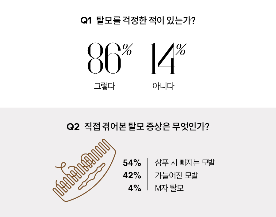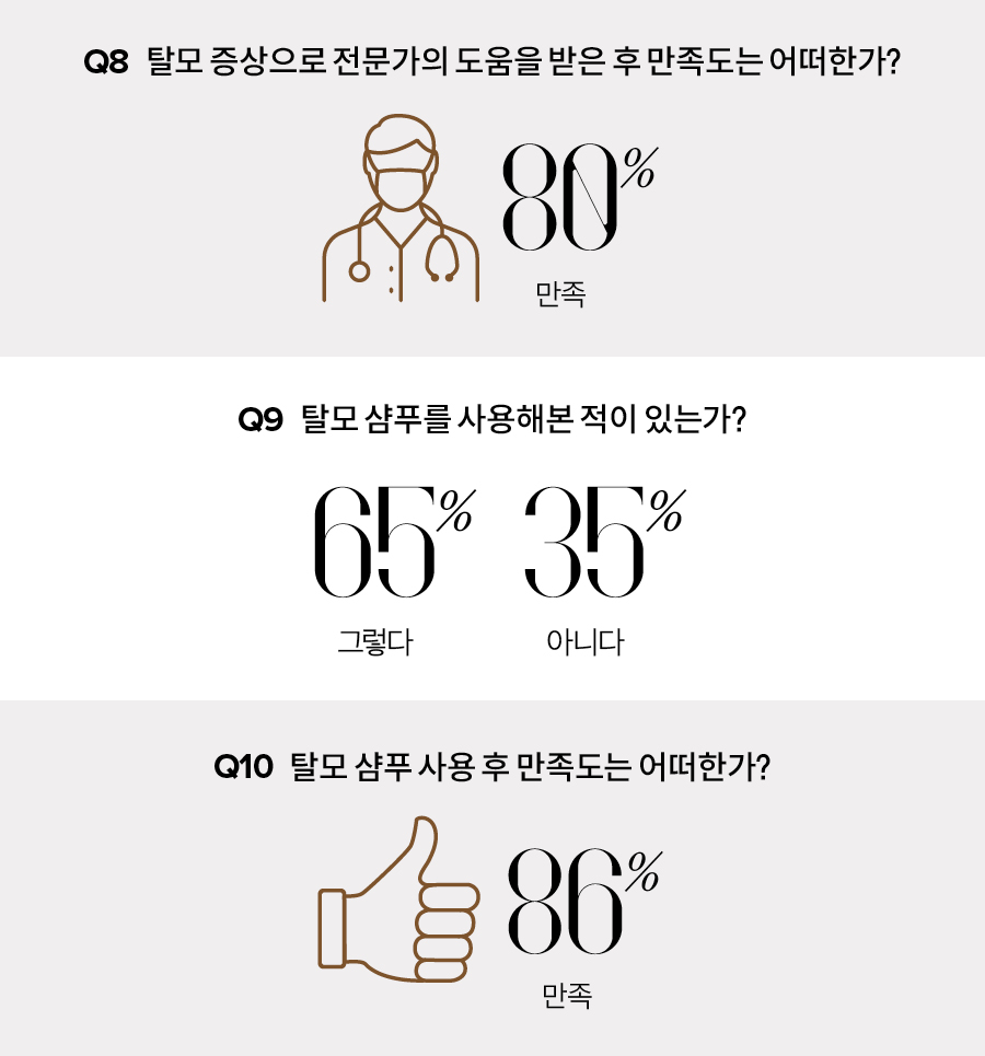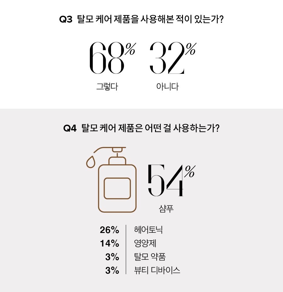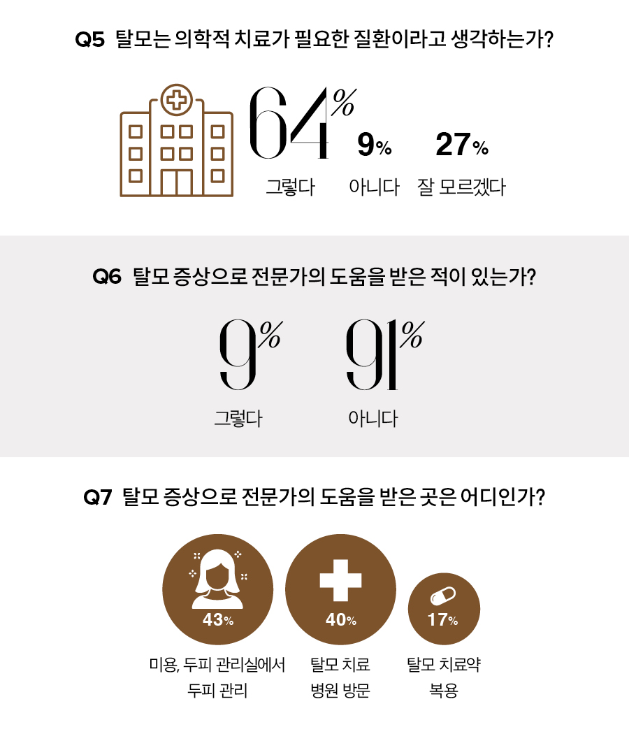 전문의와 상담을 통해 모발 이식이나 탈모 치료를 받는 것이 가장 확실한 해결 방법이지만, 경제적·시간적 여유가 없는 이들에게는 진입 장벽이 높게 느껴질 수밖에 없다. 실제로 2535 여성을 대상으로 진행한 <싱글즈> 설문조사에서 탈모를 걱정한 적이 있냐는 질문에 응답자의 86%가 탈모에 대해 고민해본 적이 있으며, 탈모는 의학적 치료가 필요한 질환이라고 생각한다고 답했지만 실제로 직접적인 치료를 경험해본 사람은 9%에 그쳤다.